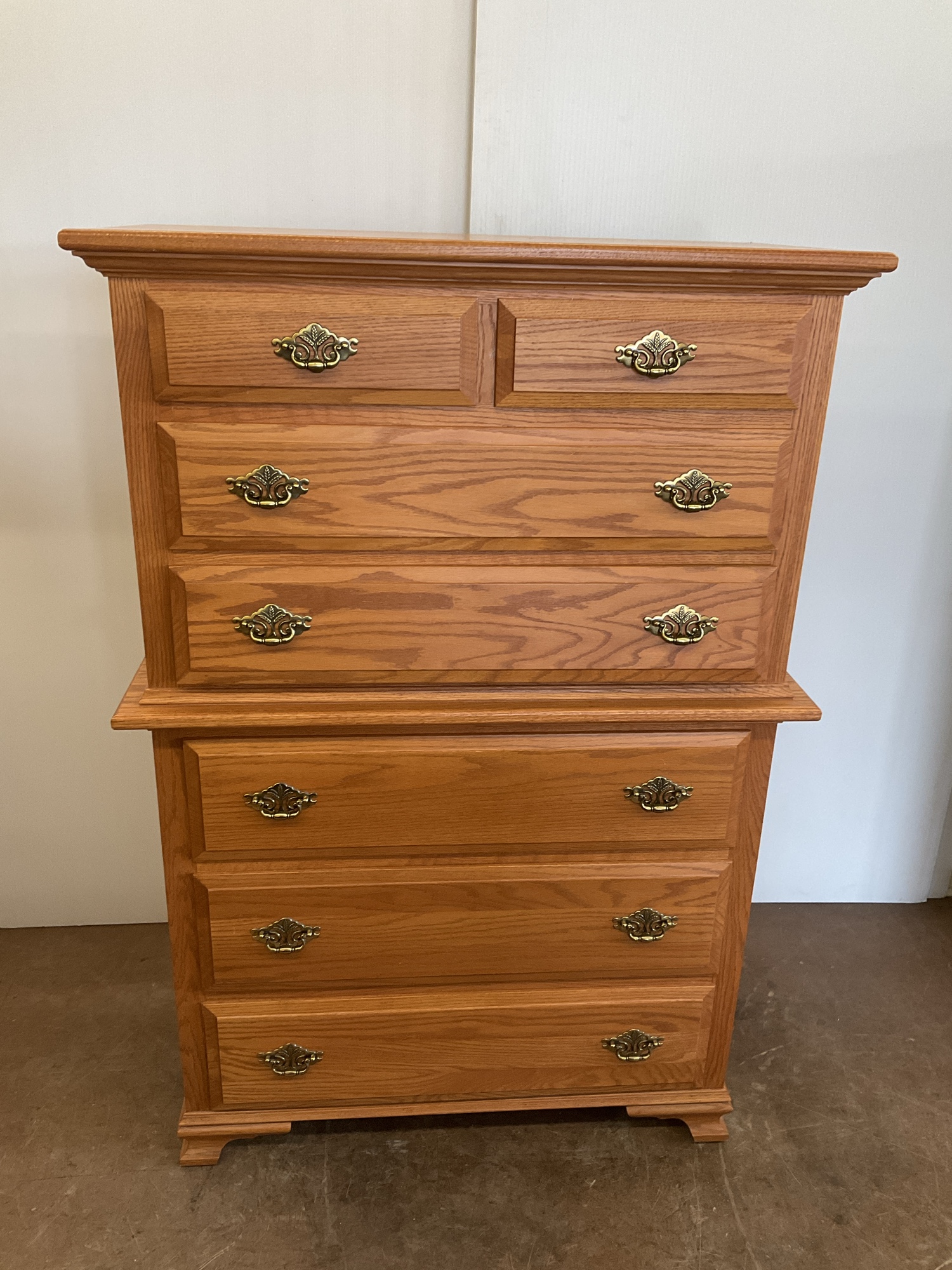 This is a tall chest on chest. It features a classic design with detailed metal drawer pulls. The unit has multiple drawers to provide ample storage space. Drawer slides are visible in the photos. 61 x 42 x 20 in.