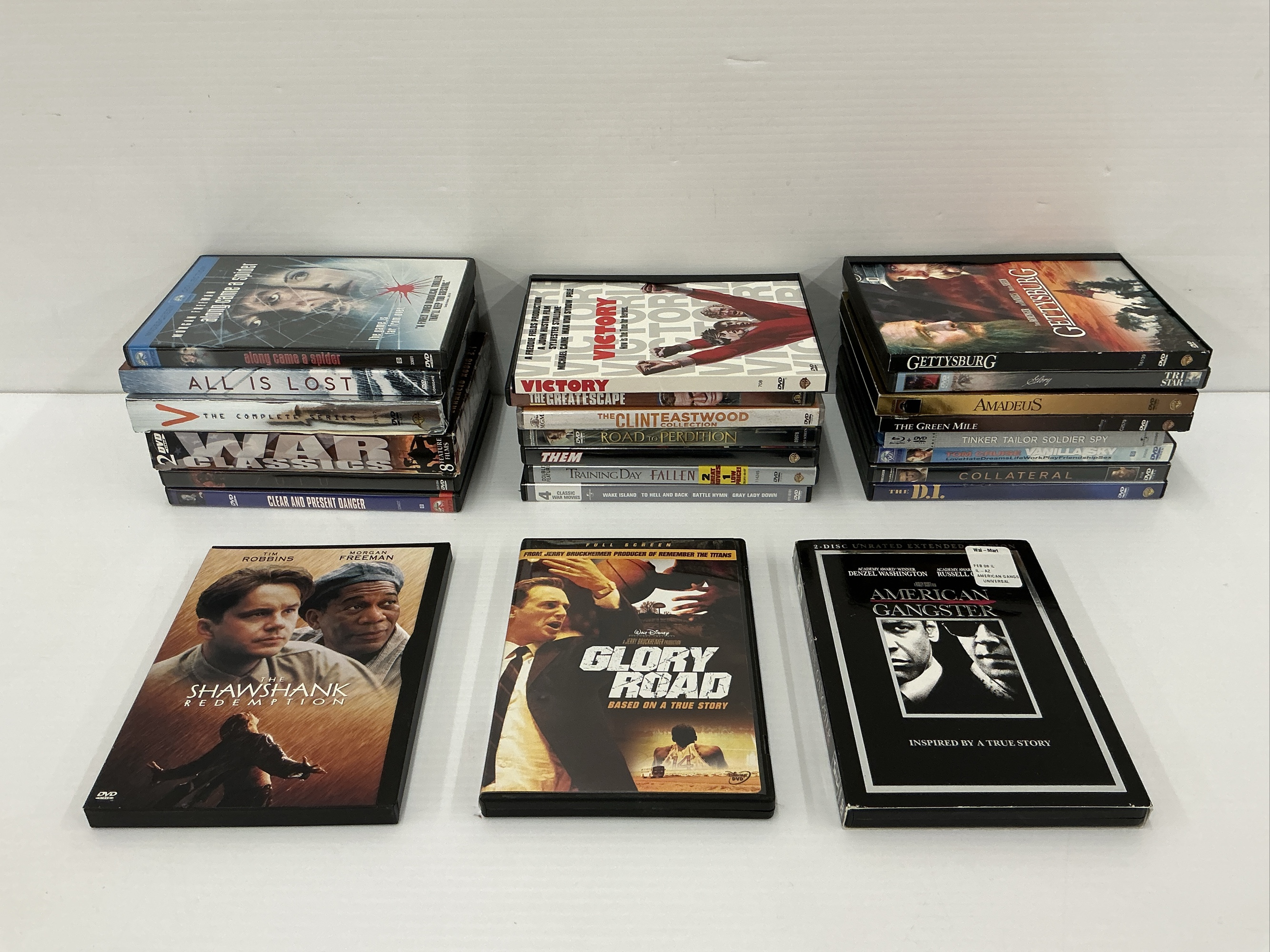 This lot includes 24 DVDs featuring a variety of movies. Titles include: Victory, The Great Escape, The Clint Eastwood Collection, Road to Perdition, Them, Training Day, Fallen, Gettysburg, Story, Amadeus, The Green Mile, Tinker Tailor Soldier Spy, Vanilla Sky, Collateral, The D.I., Along Came A Spider, All is Lost, War Classics, Zulu, Clear and Present Danger, The Shawshank Redemption, Glory Road, and American Gangster. Perfect for building your movie collection!