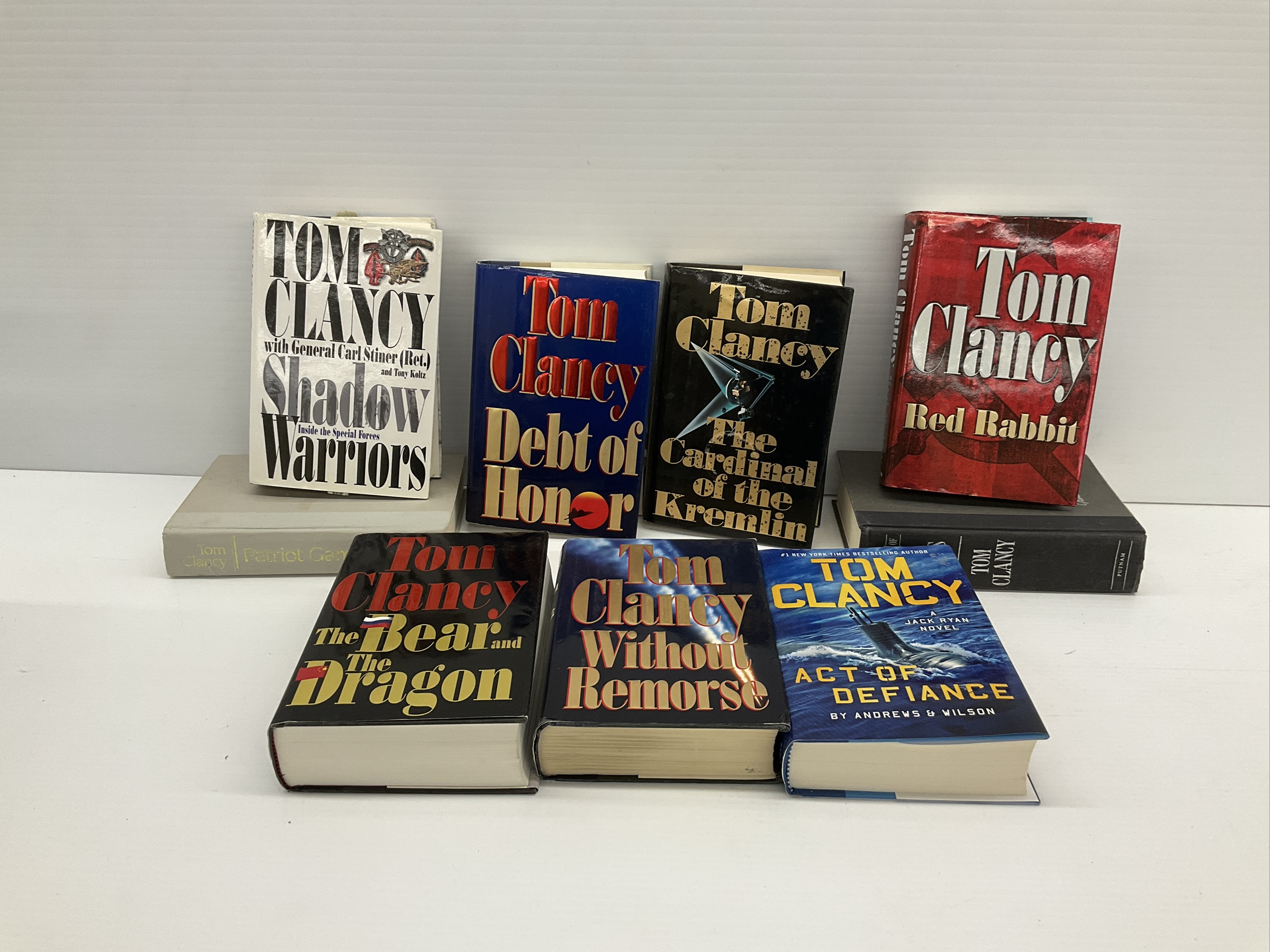 Nine Tom Clancy books, featuring titles like The Bear and the Dragon, Without Remorse, Act of Defiance, Shadow Warriors, Debt of Honor, The Cardinal of the Kremlin, Red Rabbit, and The Sum of All Fears.