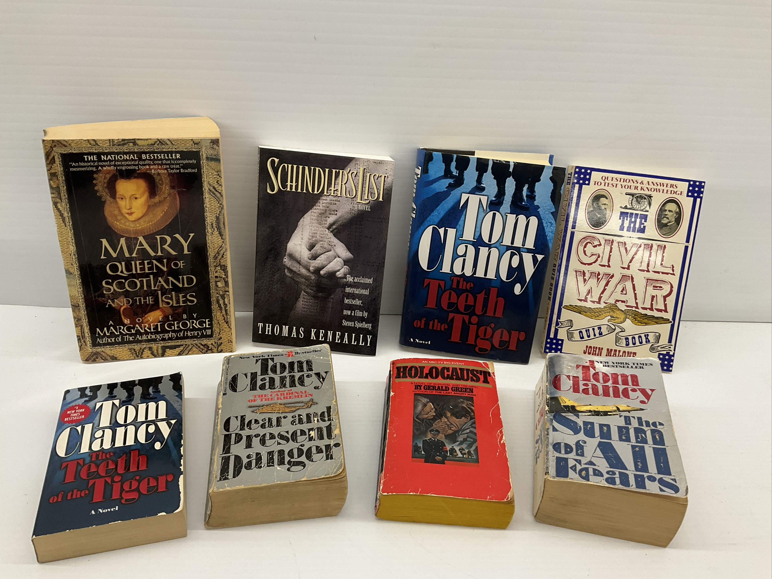 Collection of paperback books including titles by Tom Clancy (The Teeth of the Tiger, Clear and Present Danger, The Sum of All Fears), Schindler's List by Thomas Keneally, and The Civil War Quiz Book by John Malone.