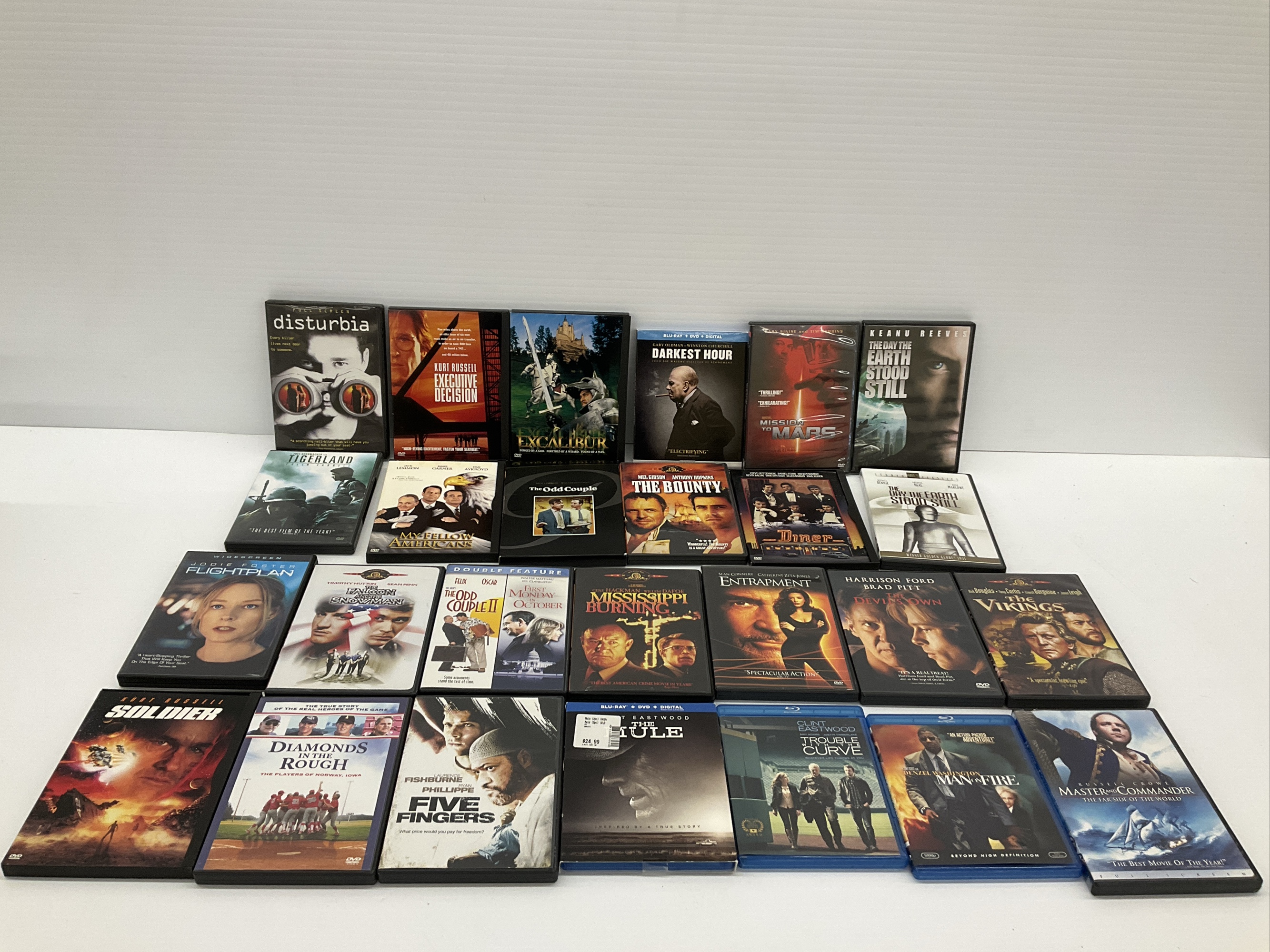 This lot features movie DVDs and Blu-ray discs, including titles like Disturbia, Executive Decision, Excalibur, The Darkest Hour, Mission to Mars, The Day the Earth Stood Still, Tigerland, My Fellow Americans, The Odd Couple, The Bounty, Diner, Flightplan, Snowman, Mississippi Burning, Entrapment, Devil's Own, The Vikings, Soldier, Diamonds are Rough, Five Fingers, The Mule, Trouble with Curve, Man on Fire, and Master and Commander: The Far Side of the World. A great selection for any movie enthusiast!
