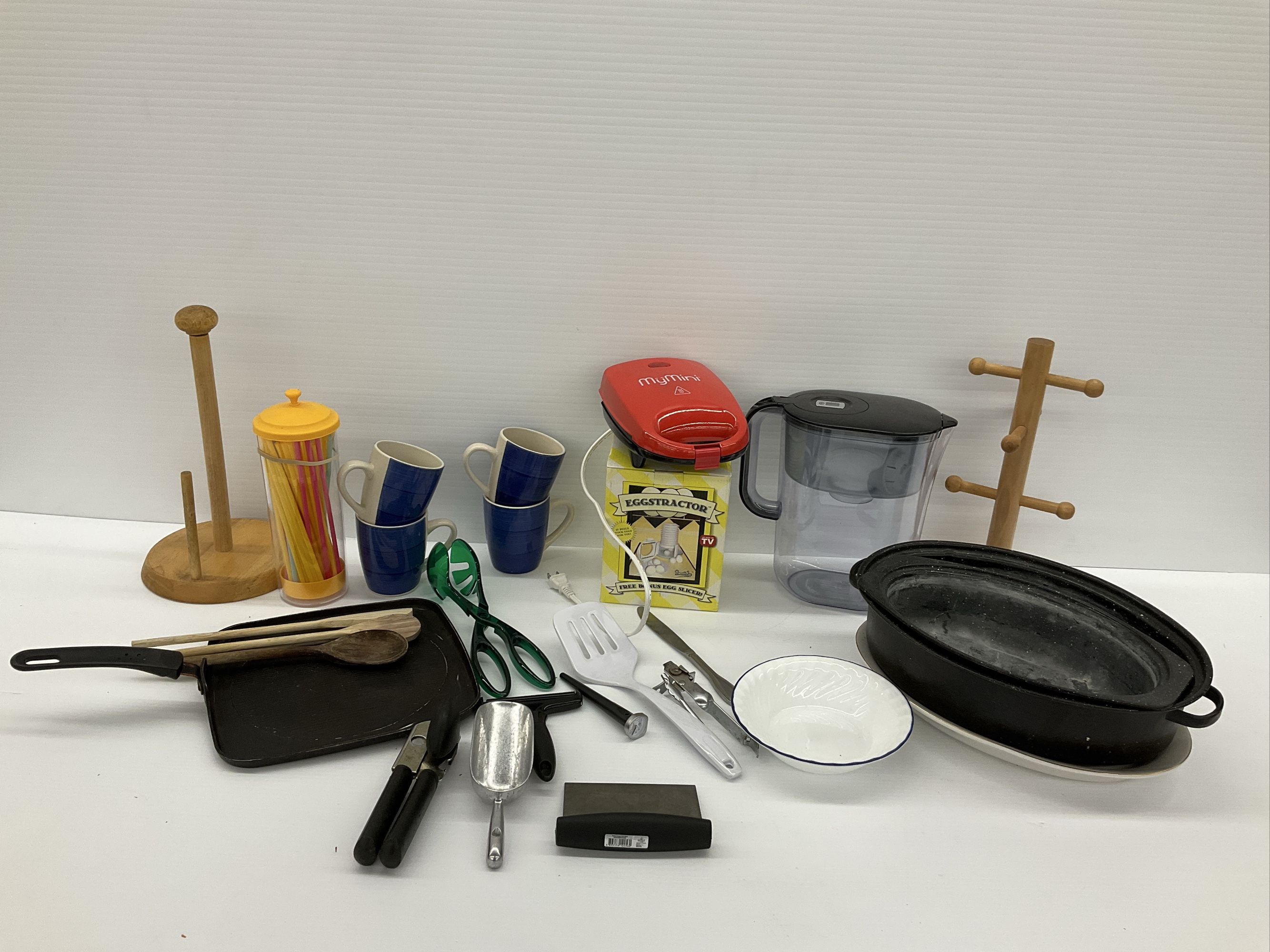 This lot includes a variety of kitchen and dining items. You'll find items such as a MyMini Sandwich Maker, a water filter pitcher, several Royal Norfolk stoneware mugs, plates and bowls, baking dishes, kitchen utensils and cooking tools, and wooden kitchen accessories. Tallest 14 in.