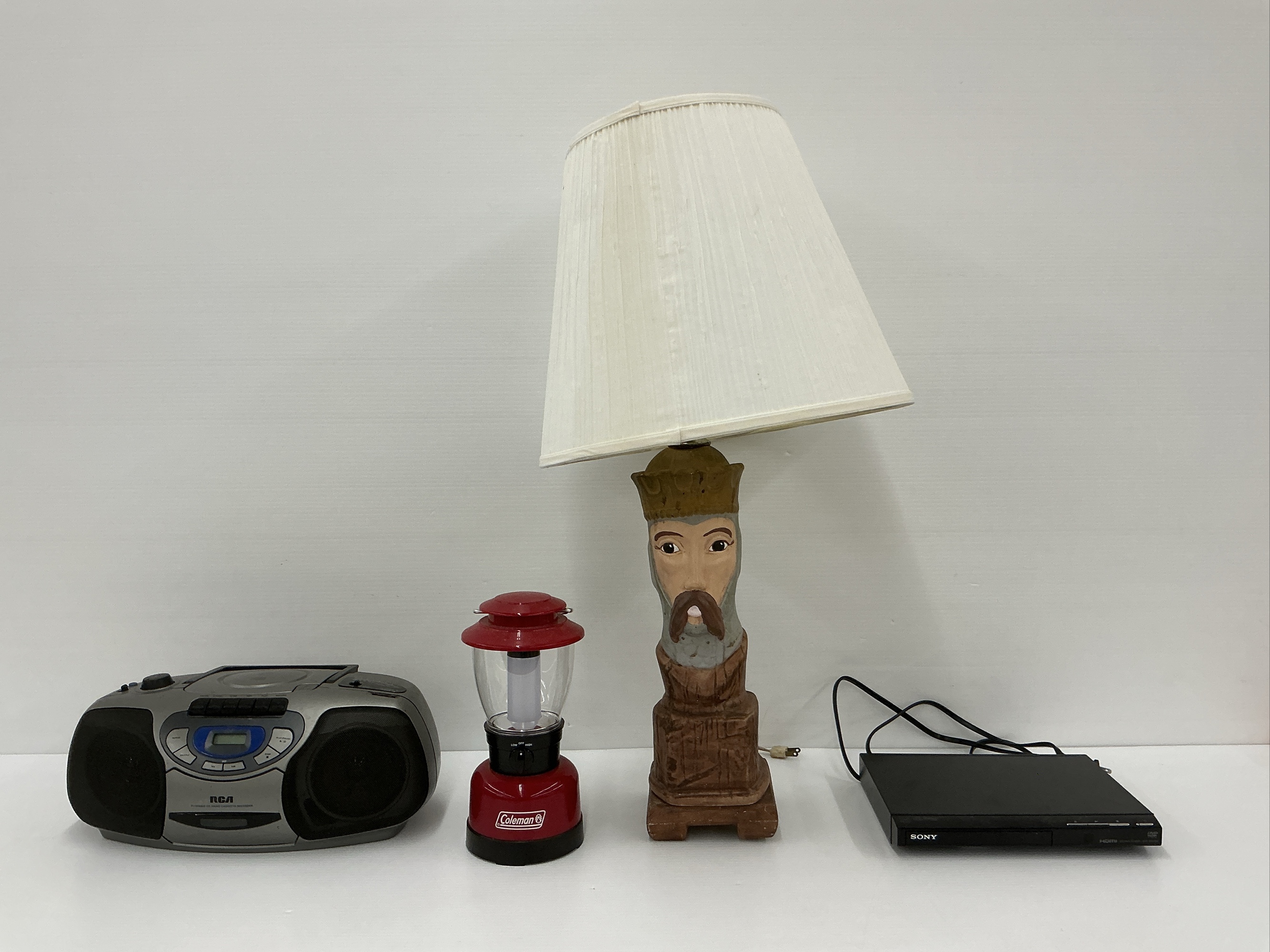 This lot includes a variety of items. There are a portable RCA CD player/cassette recorder (Model RP7800B), a Sony DVD/CD player (Model DVP-SR510H), a unique painted lamp with a character face design, and a Coleman battery operated lantern. All items power on. Lamp 30 in. tall