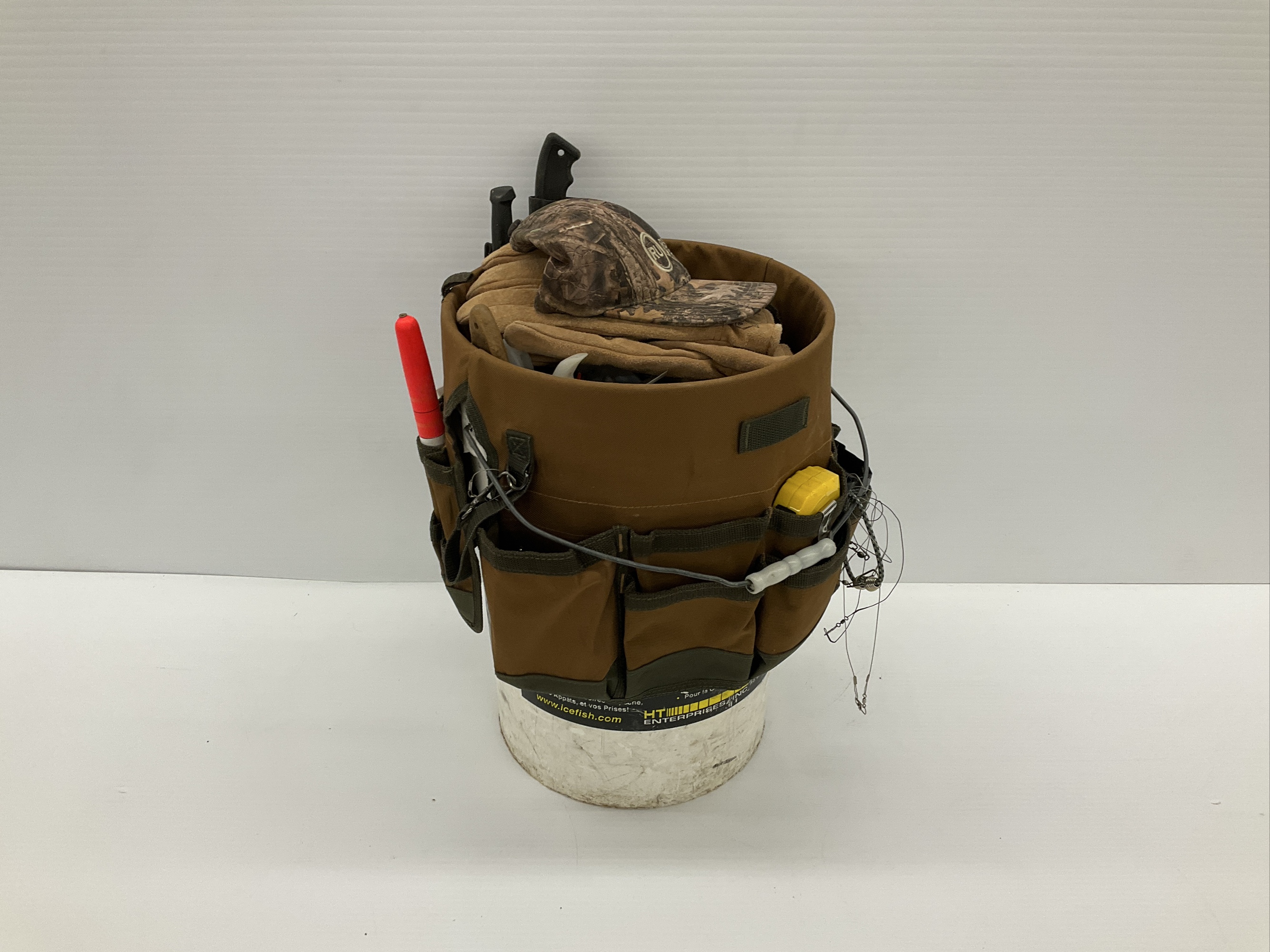 Includes a Bucket Boss bucket organizer filled with various fishing gear. Also includes tackle boxes filled with fishing lures, hooks, weights and line, gloves, knives with sheaths, and a camo hat.