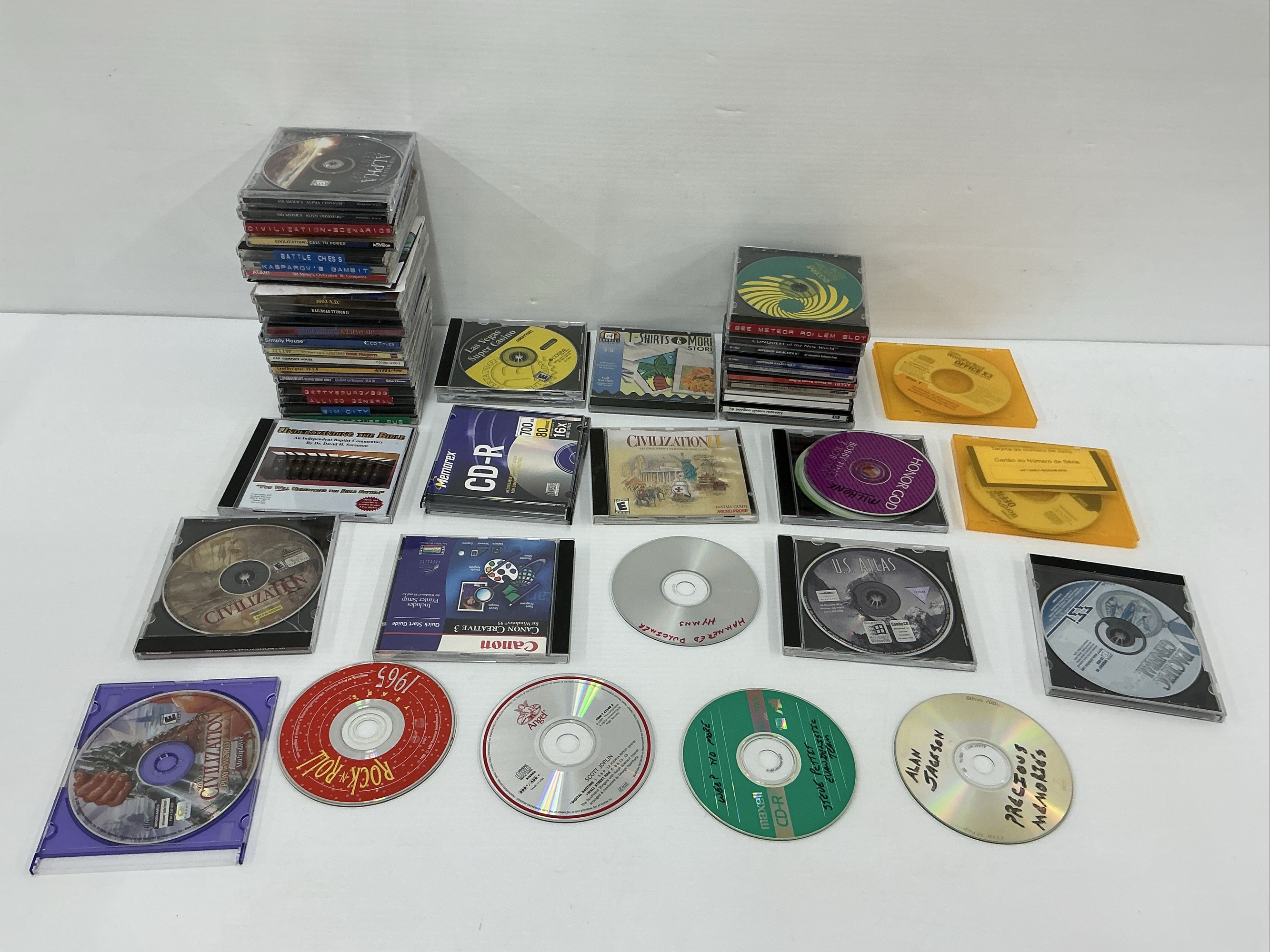 A diverse collection of PC games and software CDs. Includes titles such as Sid Meier's Civilization series, Atari games, Railroad Tycoon, and more. A variety of software and gaming for Windows 95, 98, and later.