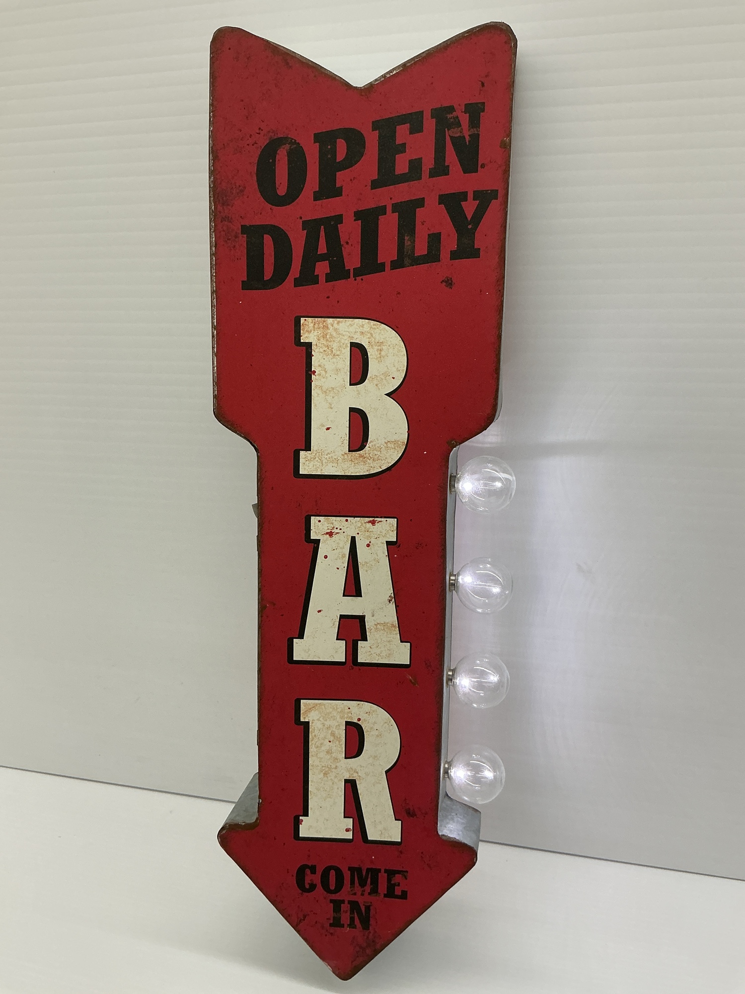 This is a metal arrow-shaped sign that reads 'Bar' and 'Open Daily, Come In' is illuminated with three lights. It would look great in a bar or entertainment room. 25 x 7.25 in.