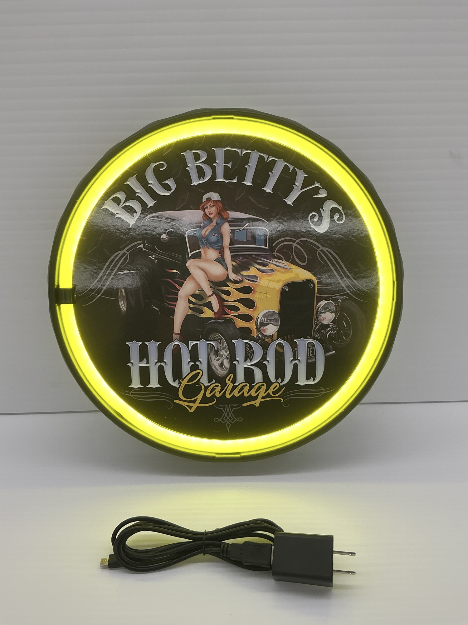 A round battery/USB operated LED sign featuring an image of Big Betty's Hot Rod Garage. The sign is lighted with a yellow-colored LED tube. It includes a USB cable and is item #562071. 12 in. dia.