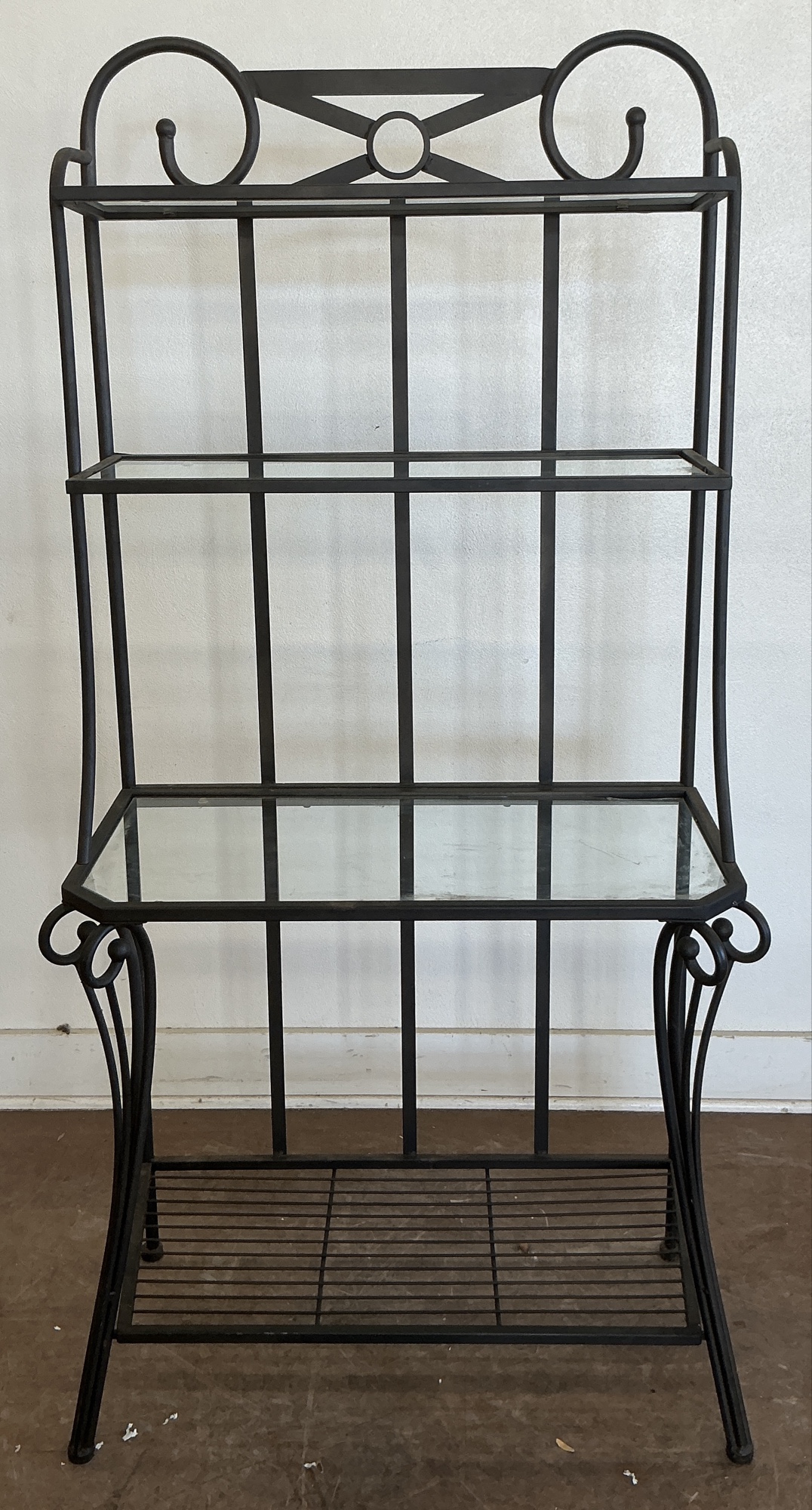 Wrought iron baker's rack with scrollwork detail. It features three glass shelves and a wire rack at the bottom for storage. One shelf has damage. 66.5 x 31.5 x 16.25 in.
