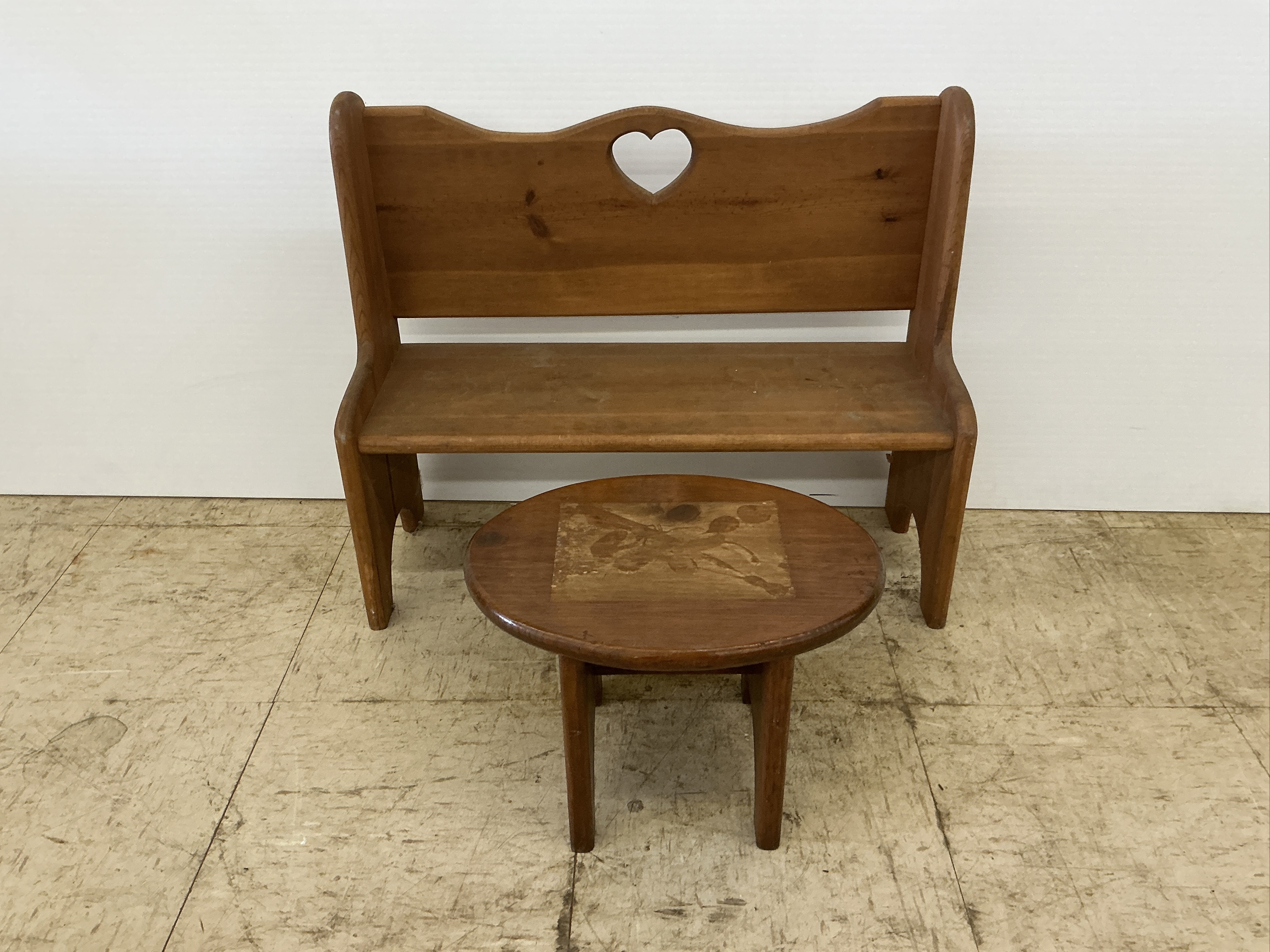 This auction features a charming wooden child's bench with a heart-shaped cutout on the back. Included is a wooden stool, completing a lovely set for a child's room or play area. The stool has spot on top. Bench 20 x 24 x 9 in.