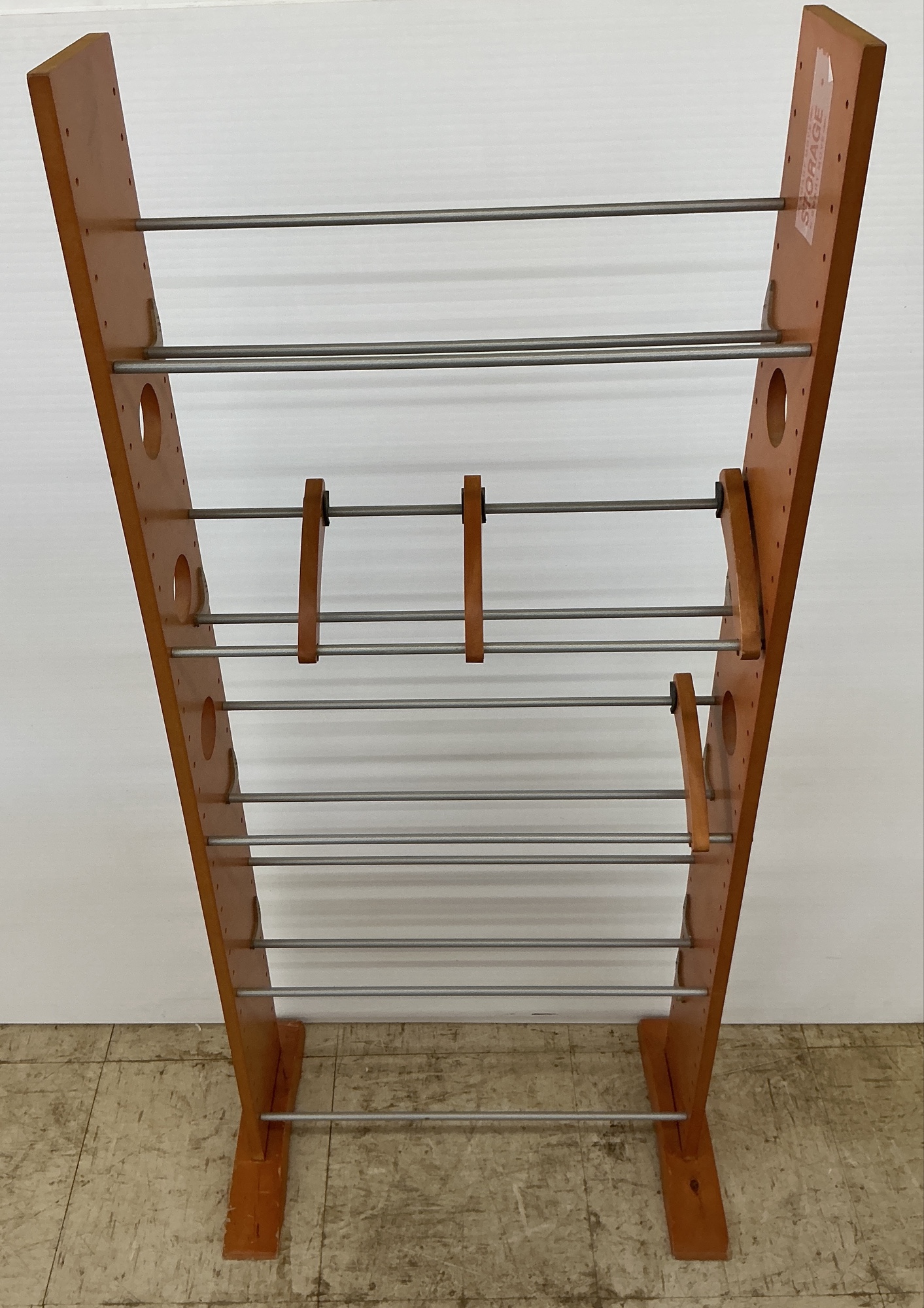 Freestanding storage rack featuring an A-frame design. The rack has wooden supports with metal bars that can be adjusted. There are also dowels that act as hangers for additional storage. 48 x 20.5 x 11.75 in.