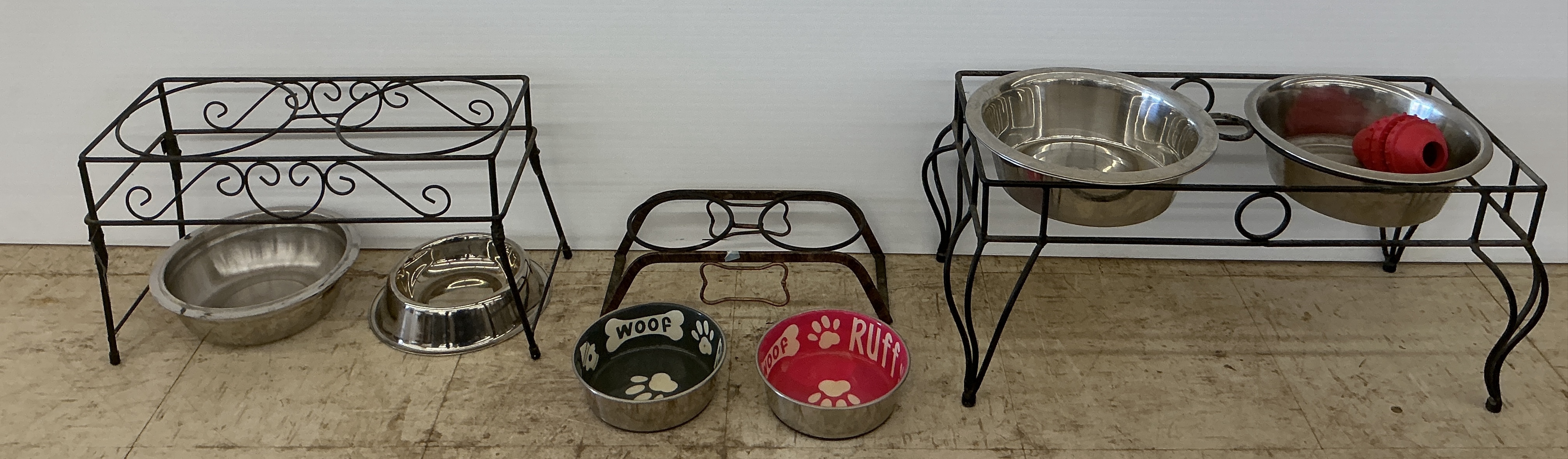 Lot of elevated dog bowls with stands, stainless steel bowls, and a rubber toy. Stands appear to be metal. One bowl is marked Bark and another Ruff. Additionally, one toy is marked Vibrant Life. Widest 25 in.