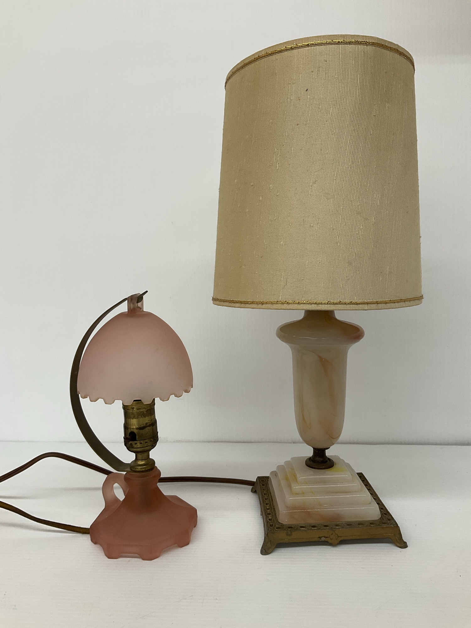 Two table lamps are included in this lot. The first is a pink satin glass lamp with a handle, and the second is a marbled stone lamp with a tan shade and decorative metal base. Tallest 17.5 in.