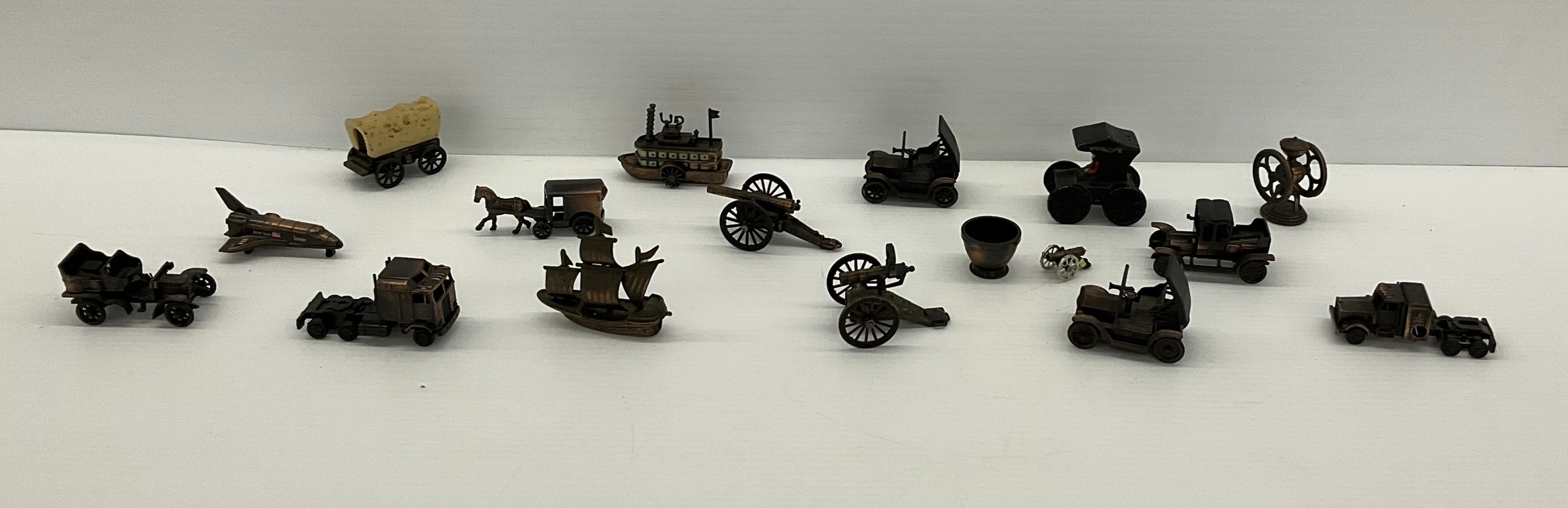 A mixed collection of diecast miniature pencil sharpeners, including cars, trucks, space shuttle, cannons, a stage coach and ships. Tallest 4 in.