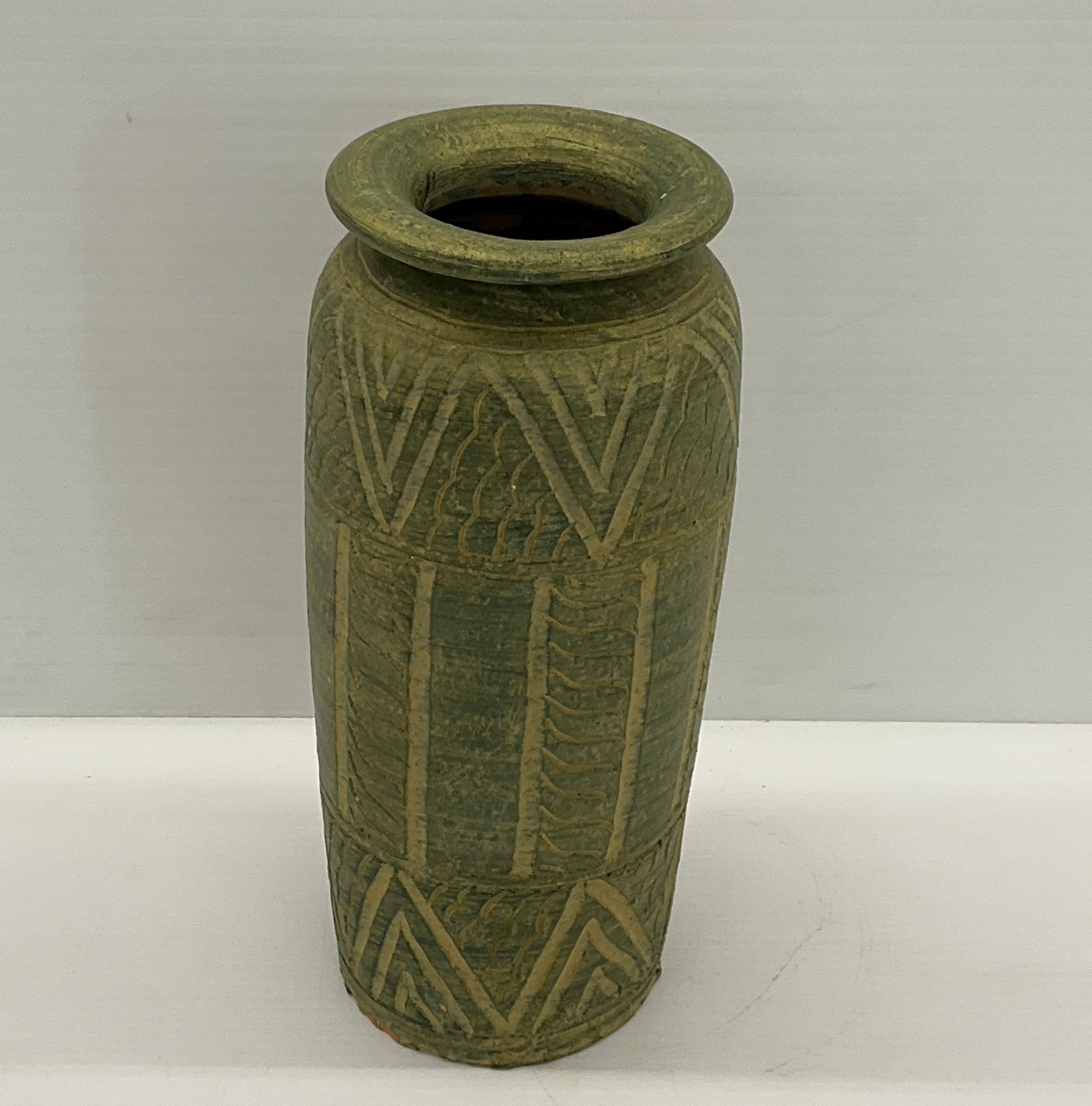 This is a green clay vase. It features an intricate geometric design around the exterior. The vase was made in Thailand. 14 in. tall