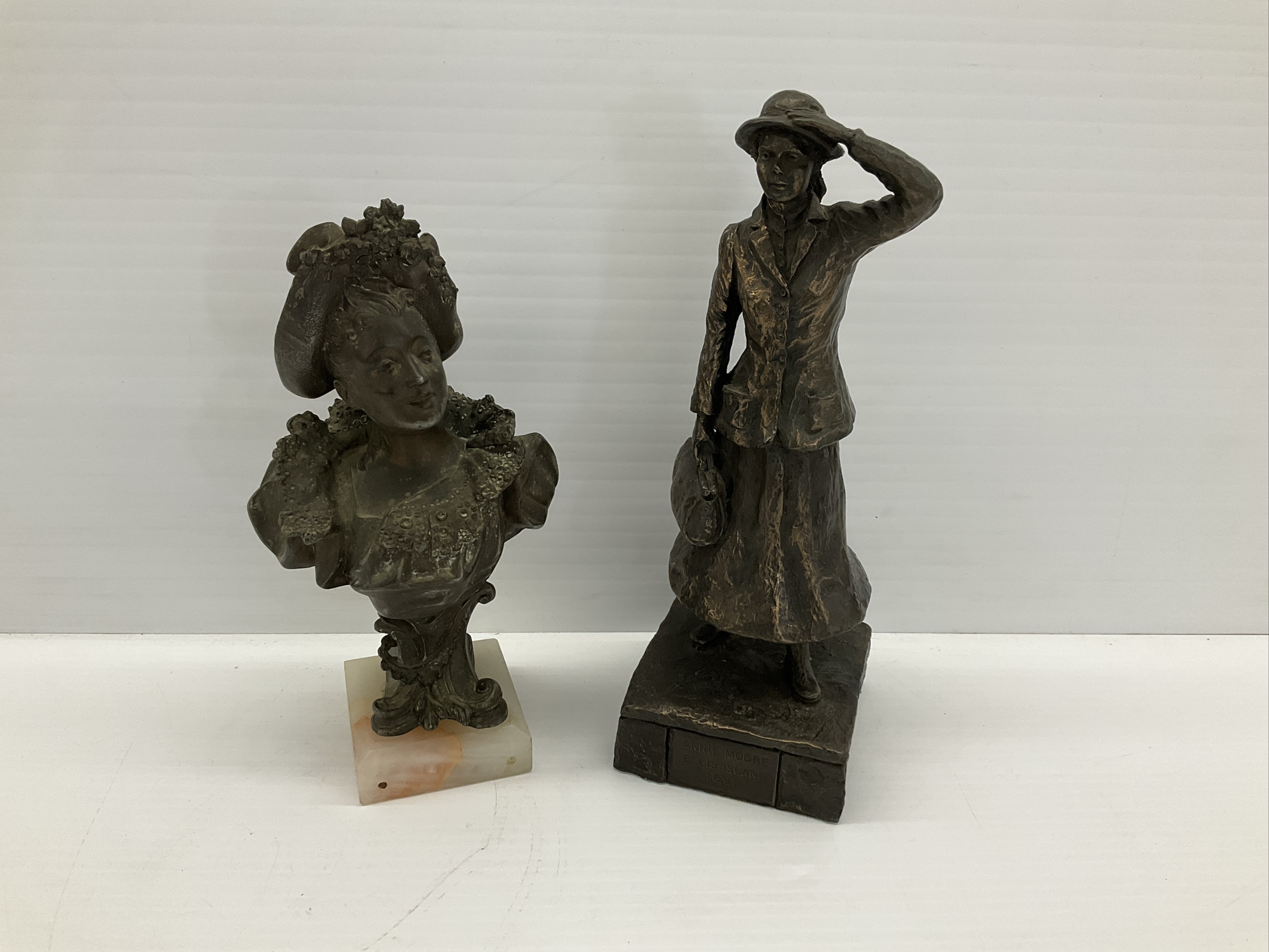 Two metal statues. One is a statue of Annie Moore standing at Ellis Island in 1892. The second is a bust. Tallest 11 in.