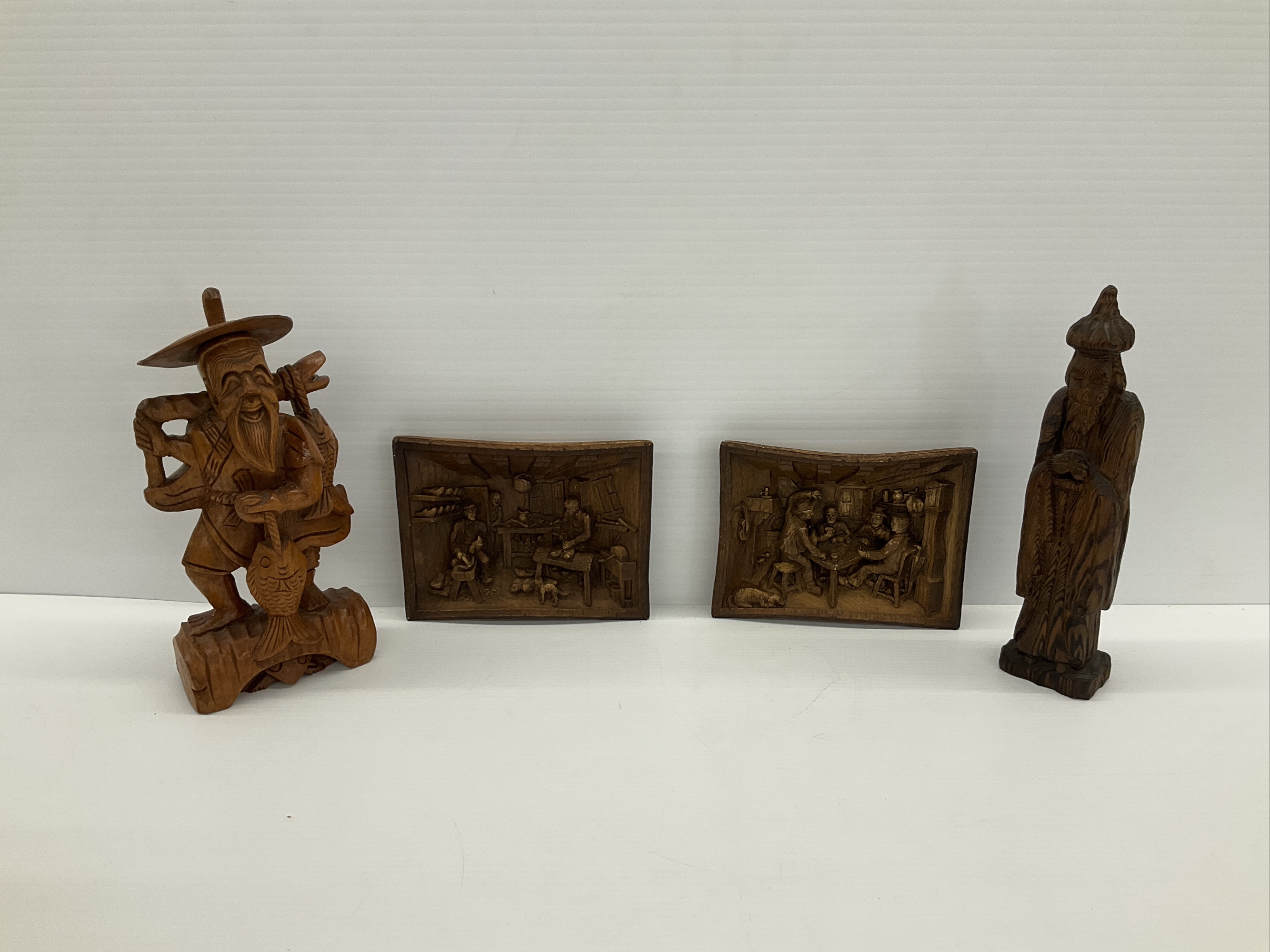 Hand Carved Wooden Asian Statues and Relief Plaques