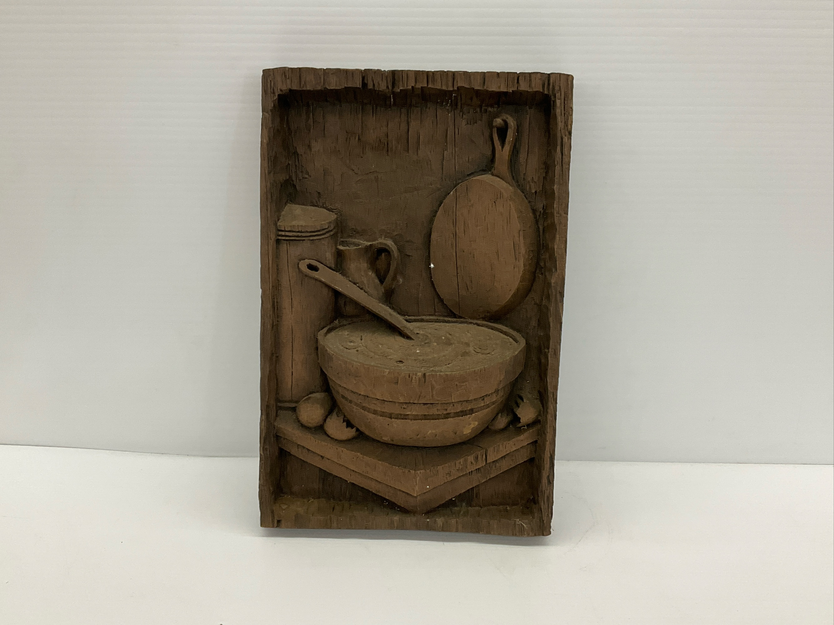 This decorative wall hanging features a charming relief carving of a kitchen still life. It depicts a bowl, eggs, mixing utensils, and other kitchen items. This piece would add a touch of rustic charm to any kitchen or dining area. 22 x 14 x 4.5 in.