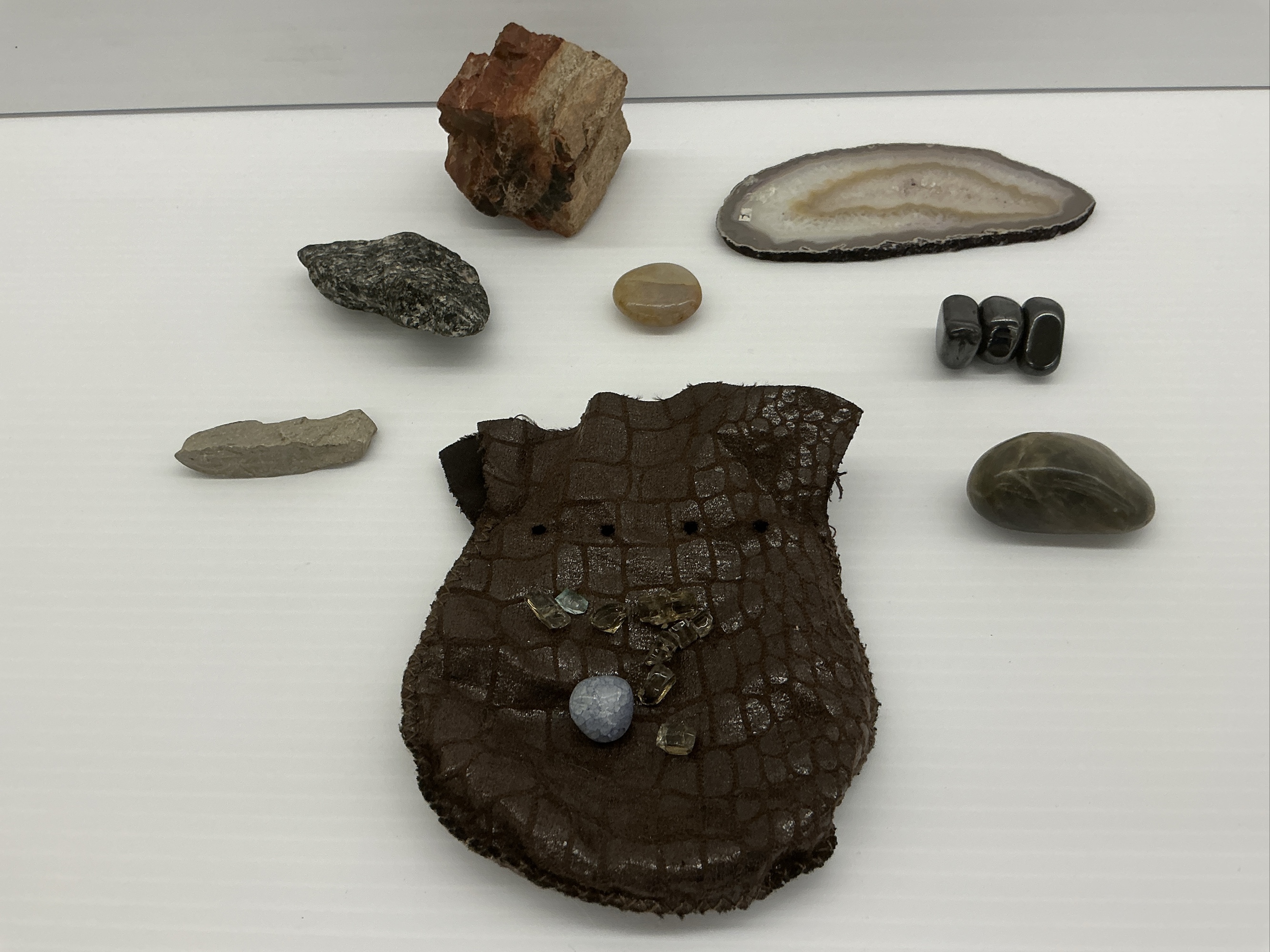 This group of rocks and minerals includes an agate slice, polished stones, and rough rock specimens. Also included is a small faux leather pouch. Largest 2.75 in.