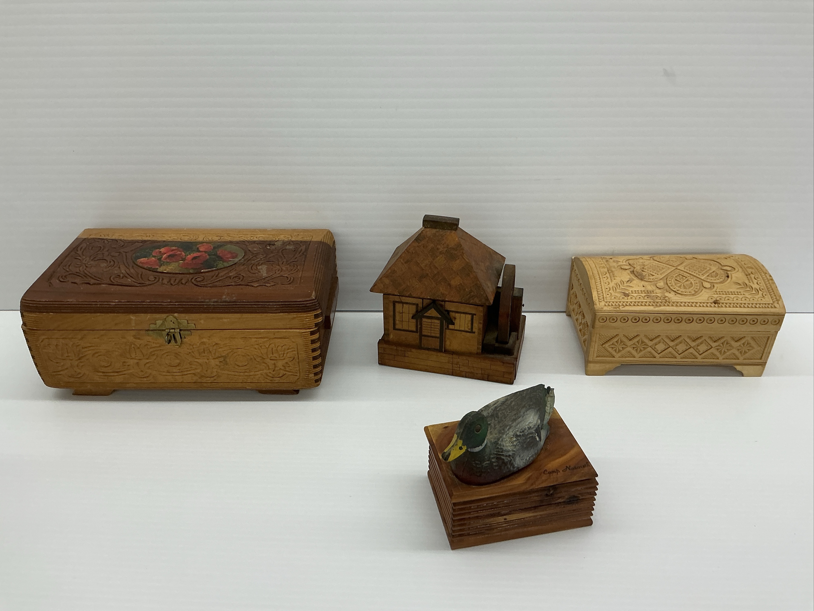 Group of carved wooden boxes with floral and geometric designs. Includes two jewelry boxes, a wooden house shaped music box and a duck trinket box signed "Camp Nazareth". Widest 10 in.