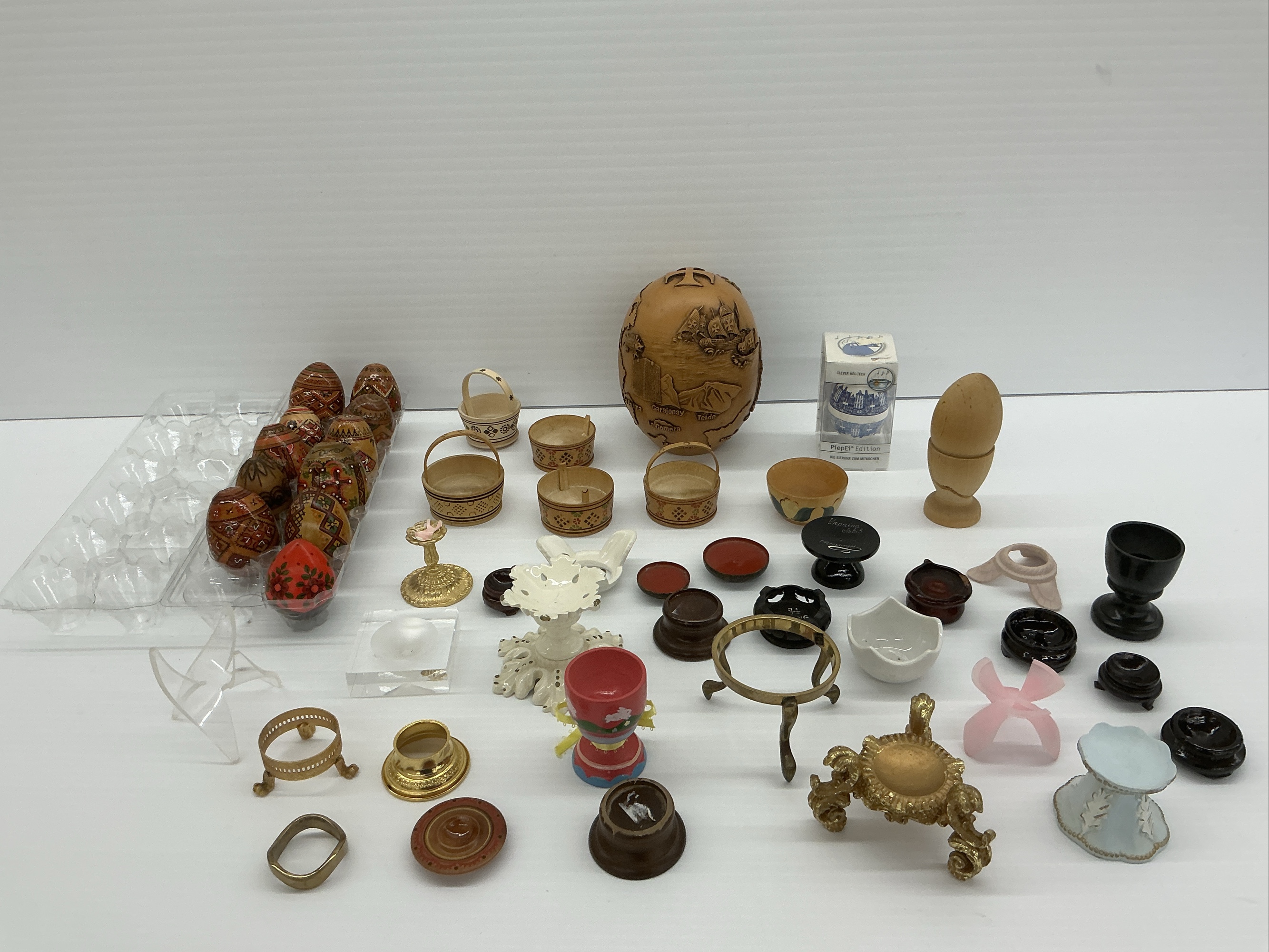 Collection of items that are mostly wooden that include egg stands, and decorative eggs. One item is marked Avon 1994. Tallest 5.75 in.
