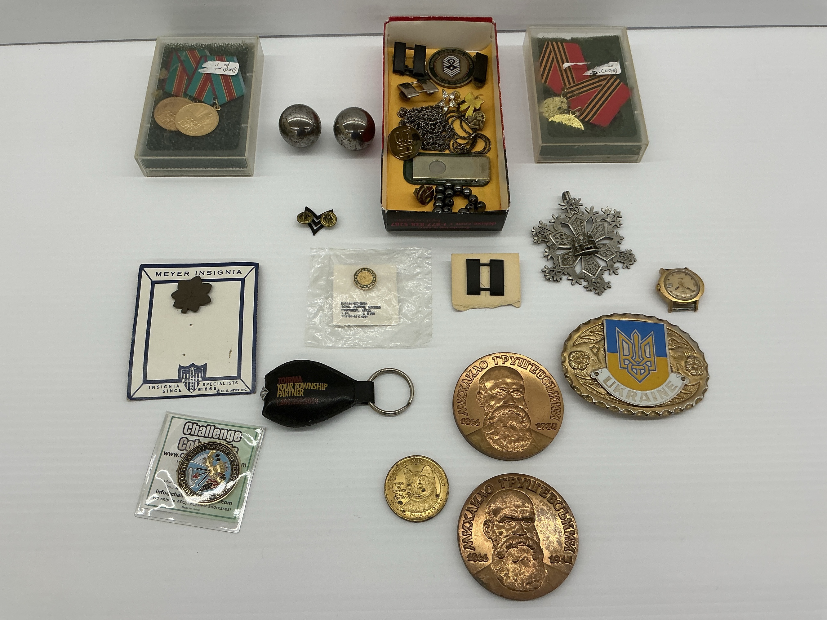 This lot features a diverse collection of items including military medals (possibly Soviet era), challenge coins, insignia, Ukrainian-themed belt buckle, commemorative medallions, a vintage Timex watch, and various other collectibles. A unique assortment for any military or memorabilia enthusiast. We do not guarantee watches to run.