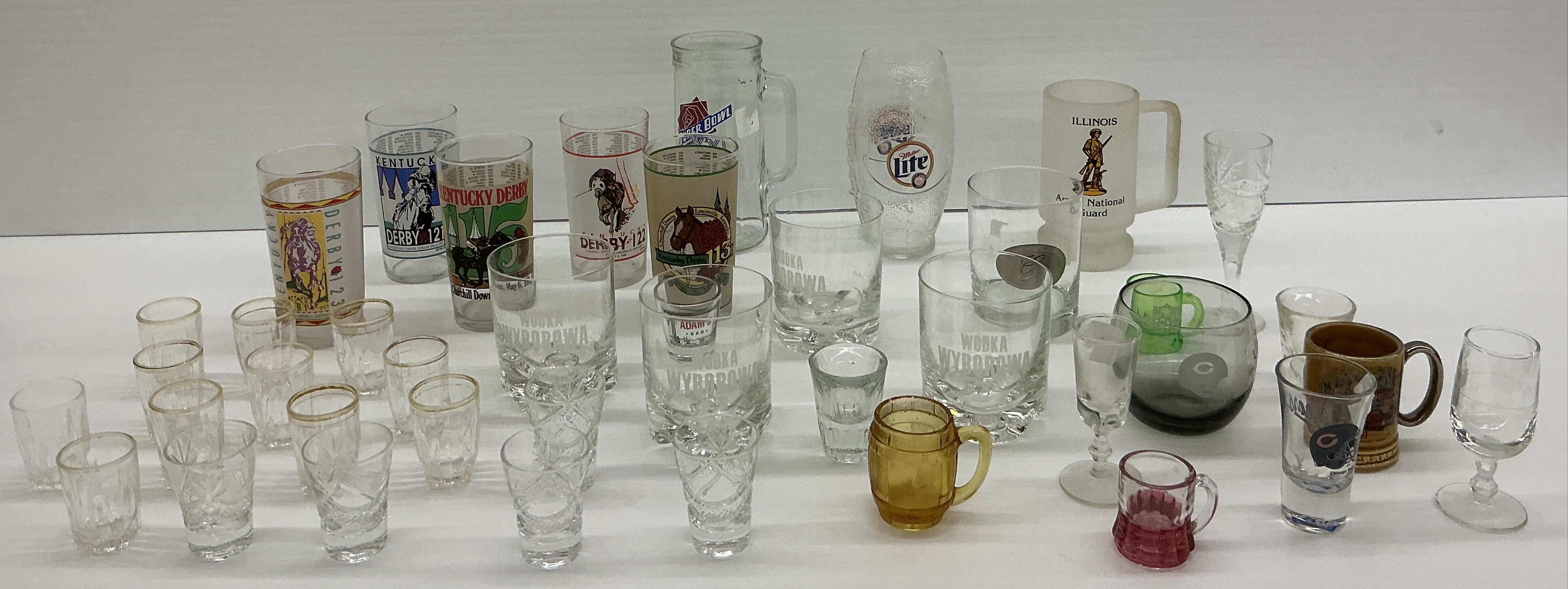 This lot features a variety of glasses, mugs, and shot glasses, including Kentucky Derby glasses, beer promotional glasses, small shot glasses, and other interesting designs. See photos for details. Tallest 7 in.