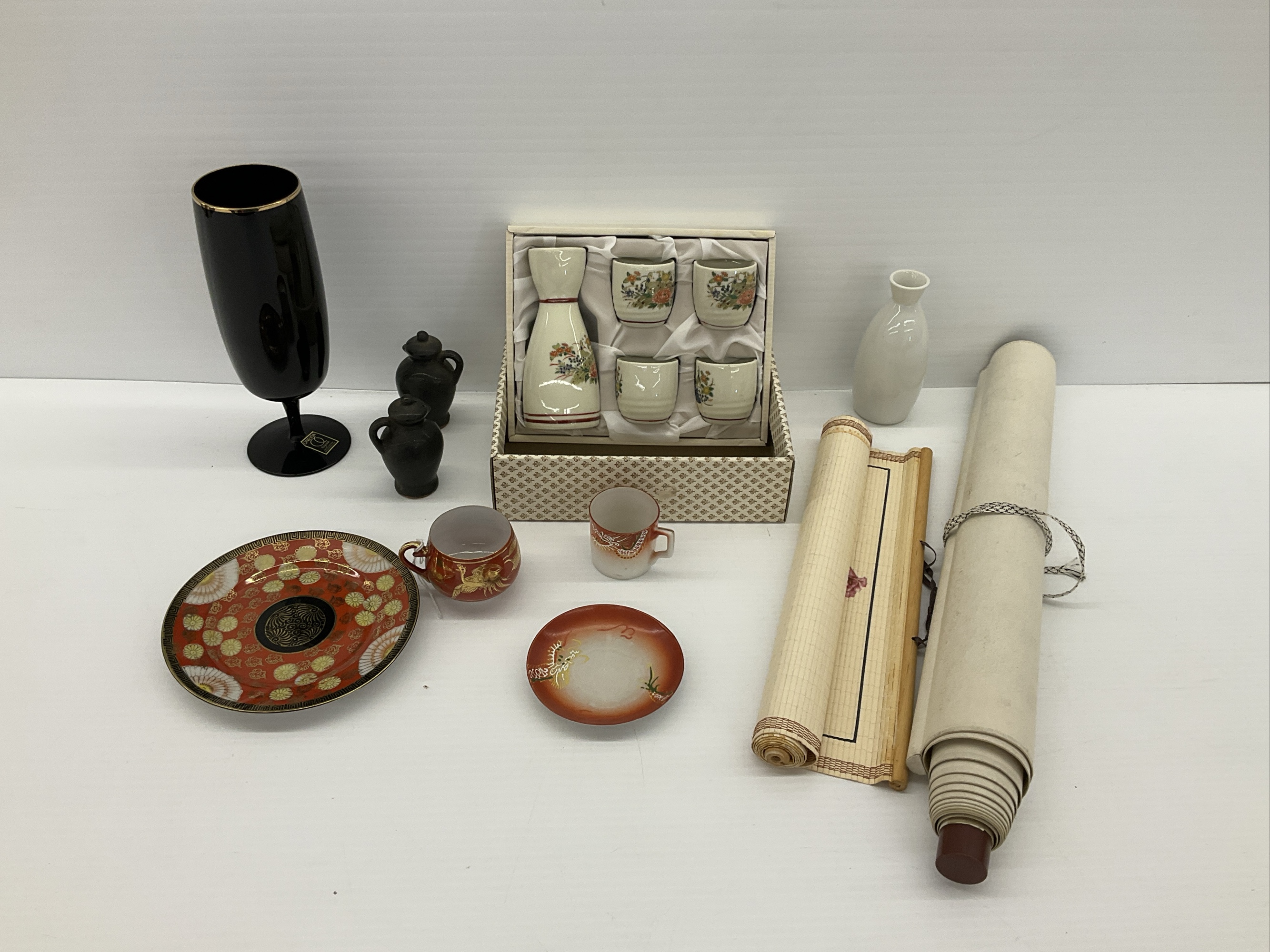 Japanese Art Scroll, Sake Set, Oneida, and Decorative Glassware