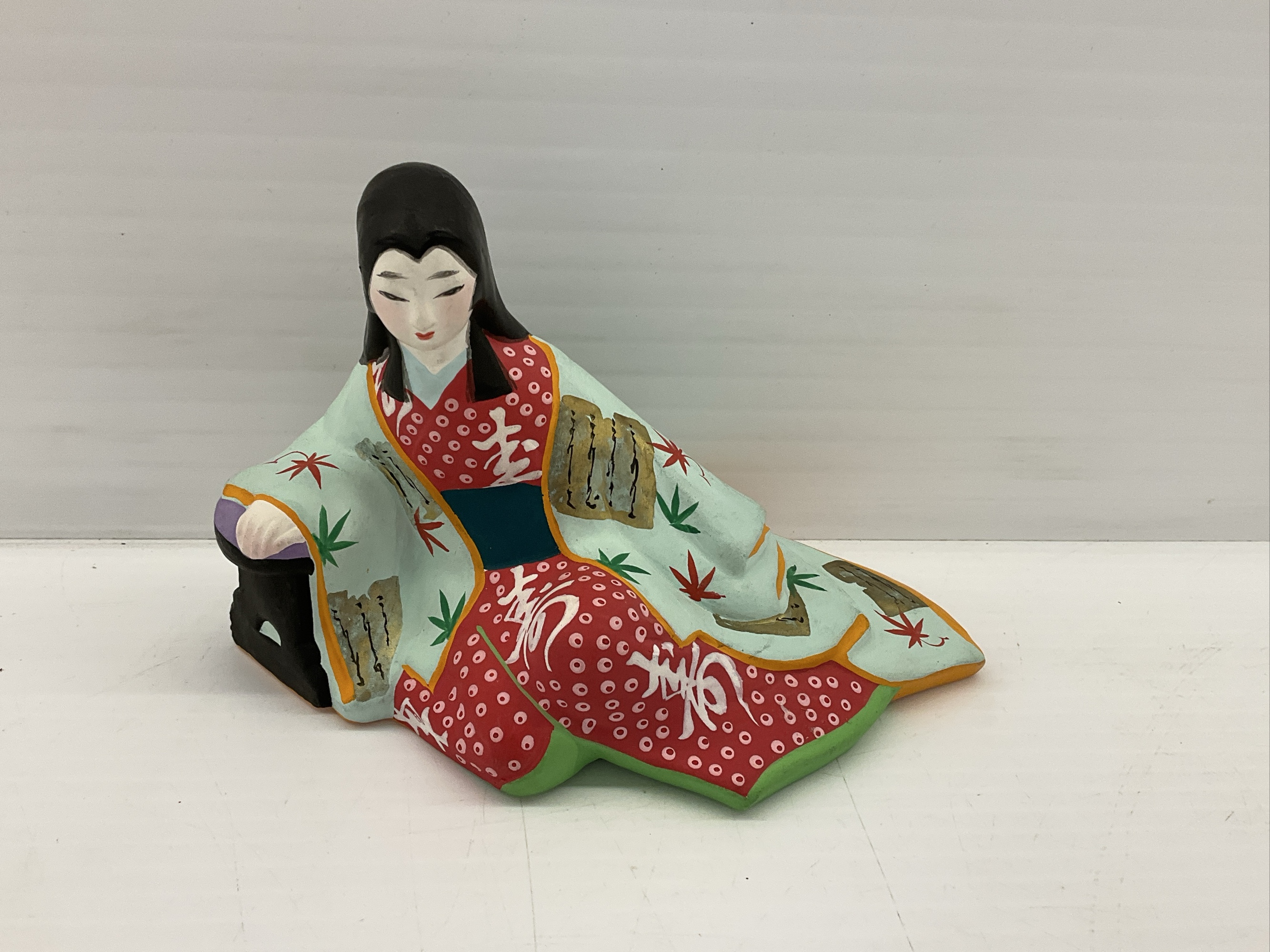 Hand painted Kokeshi doll figurine. Depicts a seated Japanese figure with colorful robes and details. Depicts explicit scene on underside. A unique decorative piece. 4.5 x 7 x 4.5 in.