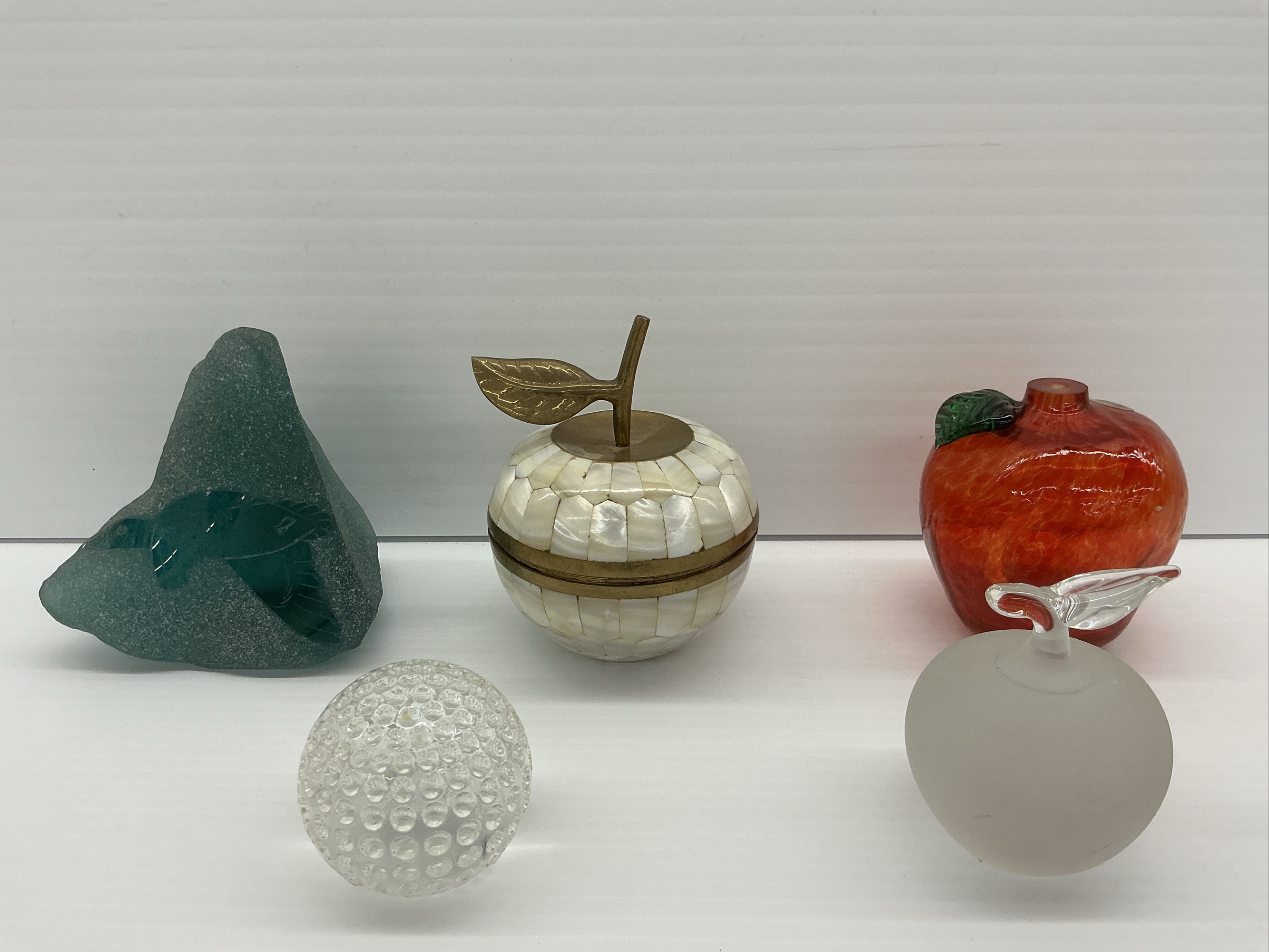 This collection features a variety of decorative glass pieces. Included are several apple-shaped paperweights in clear, orange, and a mother of pearl with brass accents apple dish. There is also a uniquely shaped glass piece with a turtle design by 'Berube Studio Canada', and a clear round glass paperweight with a textured surface. Tallest 4.75 in.