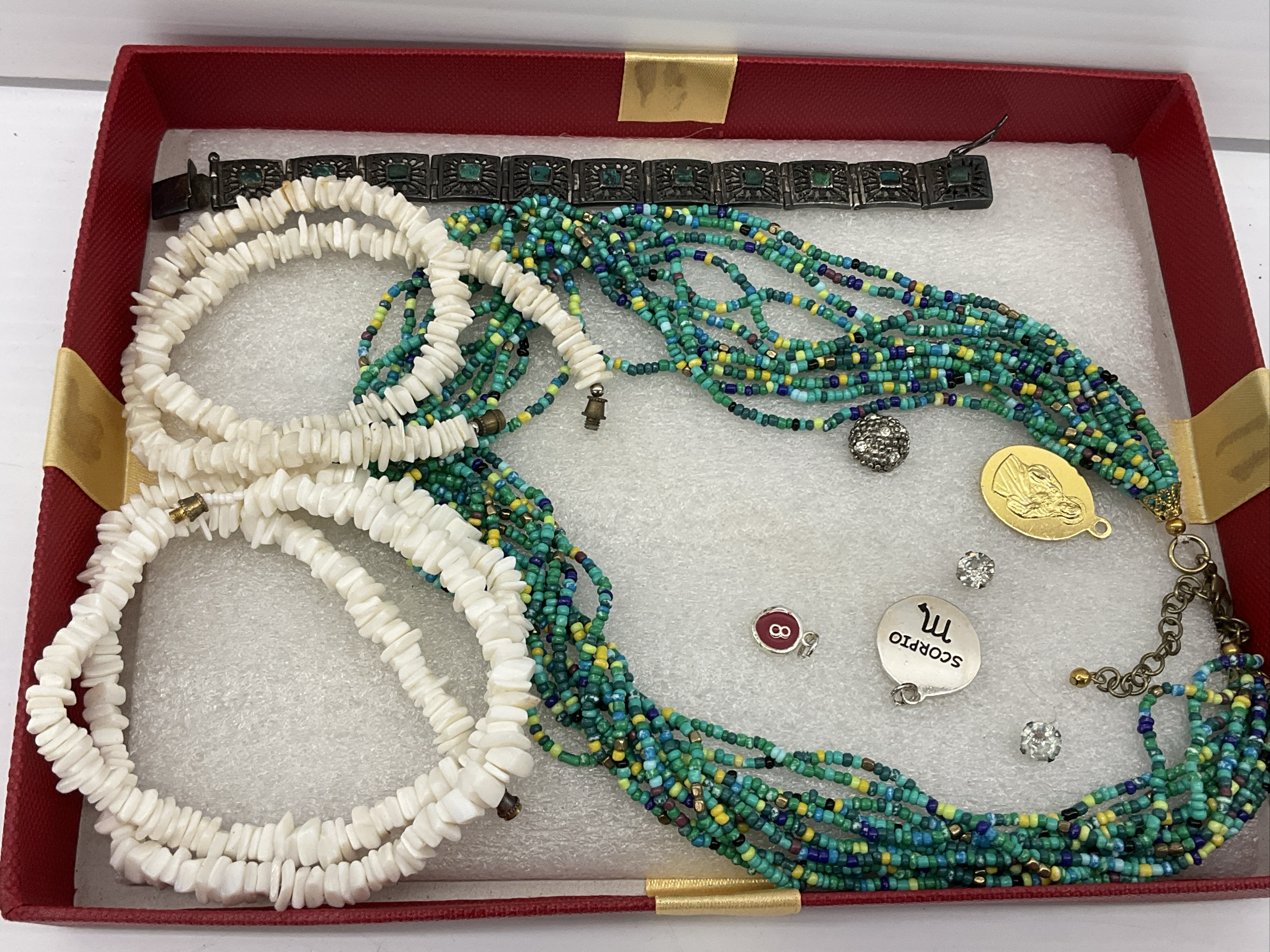 This lot contains several pieces of jewelry, including a multi-strand beaded necklace, two white necklaces, pendants and a patterned bracelet.