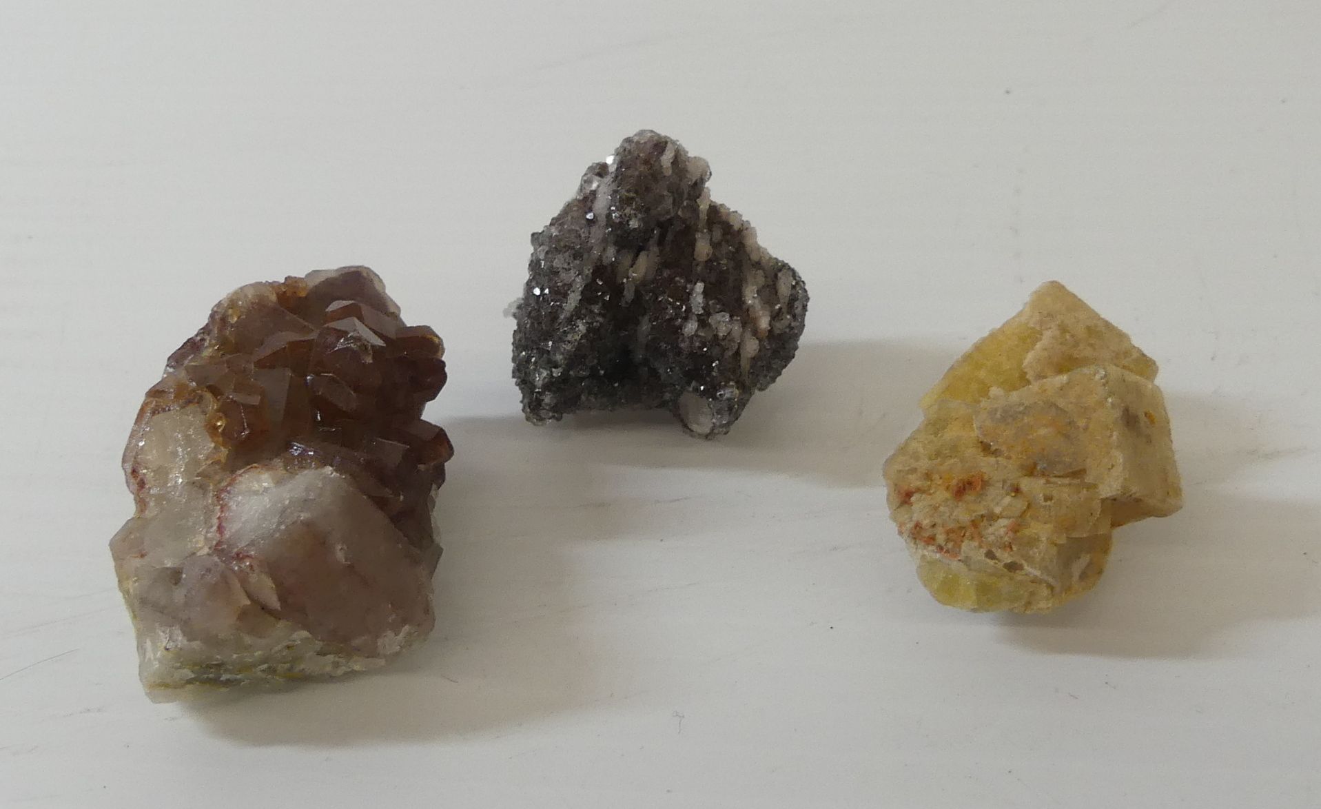 Collection of three mineral specimens, each with distinct characteristics and coloration. Includes a yellow mineral specimen, a grey and white mineral specimen, and an orange specimen.