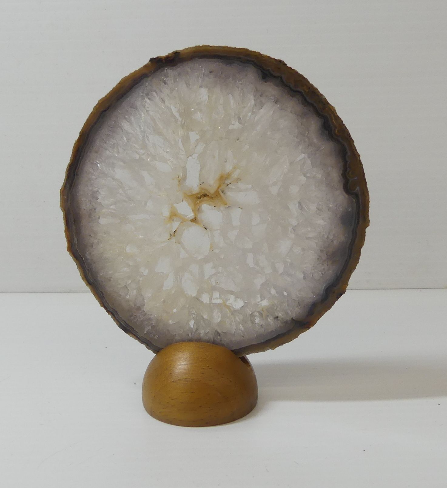 This listing is for a polished agate slice specimen mounted on a wooden display stand. The agate features a beautiful geode center and distinct banding.