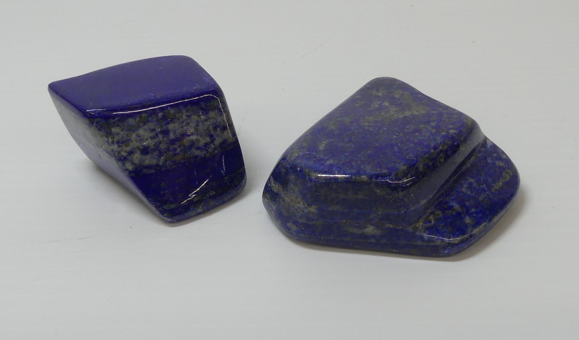 Two pieces of polished Lapis Lazuli stone, each with a rich blue hue and unique natural markings. These decorative stones add character to any space.