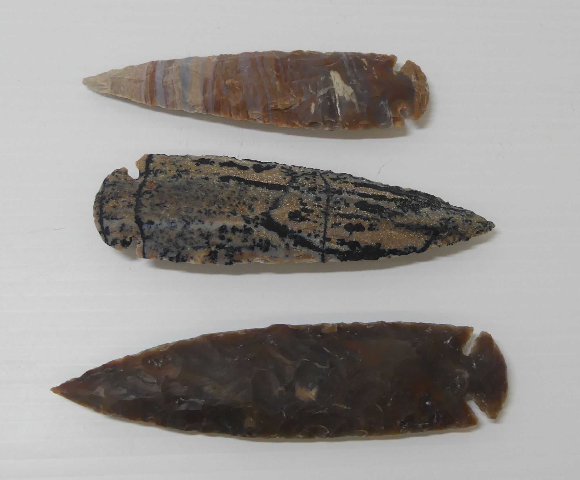 Three assorted arrowheads in various types of stone, with visible knapping marks.