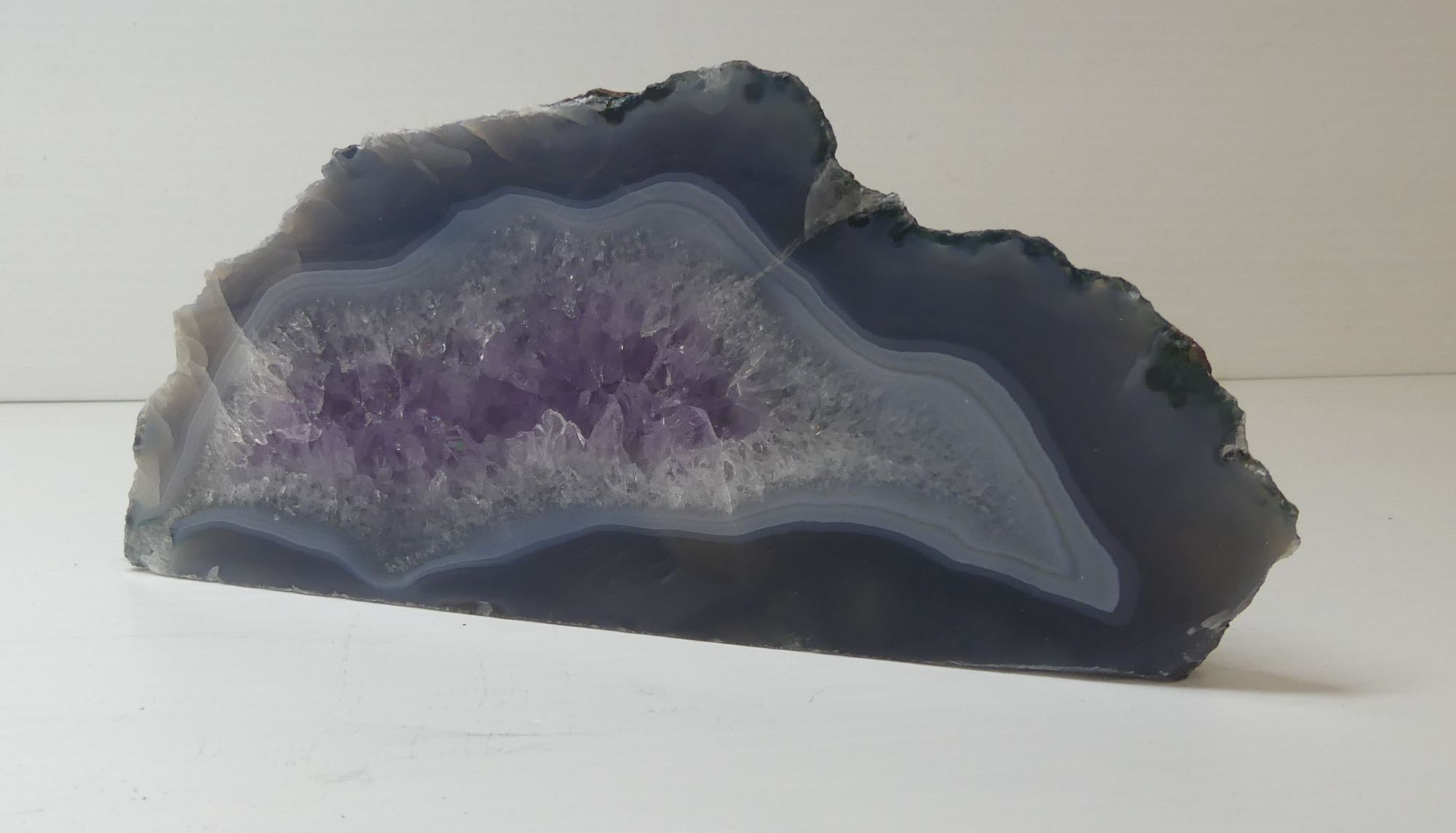 A beautiful Amethyst geode slice, perfect for display or a collector. The piece has a dark purple exterior with a sparkling amethyst crystal center and a pale interior.