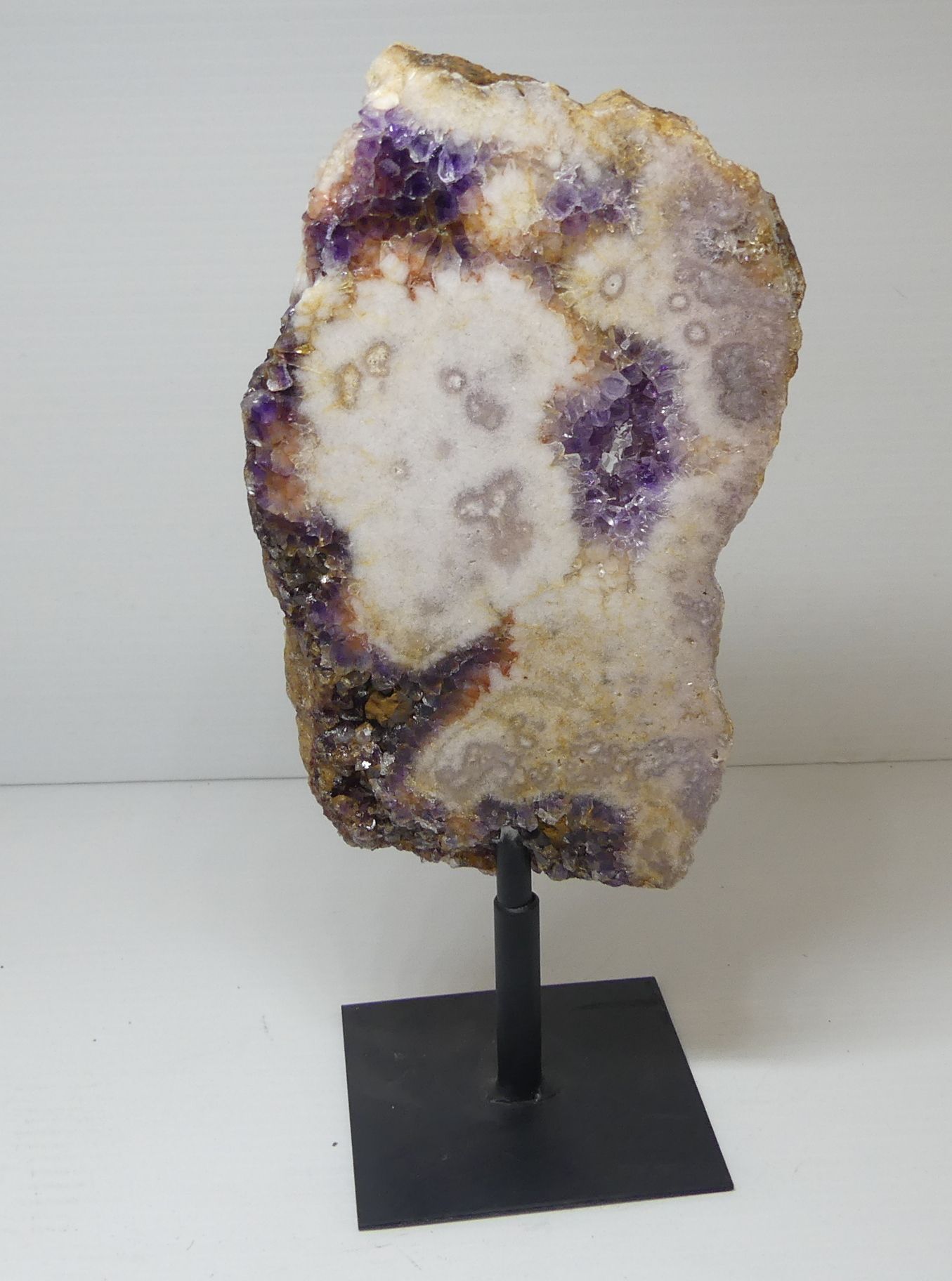 Striking amethyst geode slab displayed on a sleek stand. Features beautiful crystalline formations. A unique decorative piece for any space.