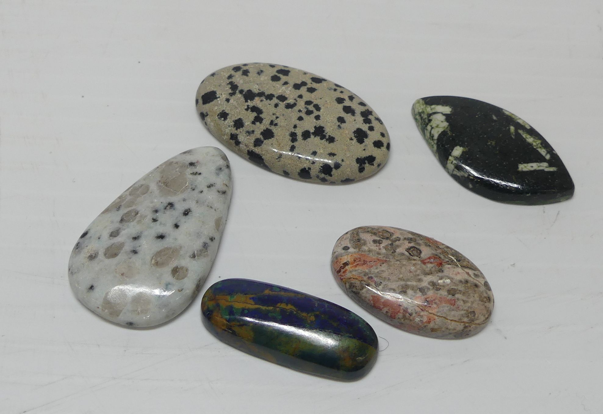 Collection of various polished decorative stones, each with unique patterns and colors.