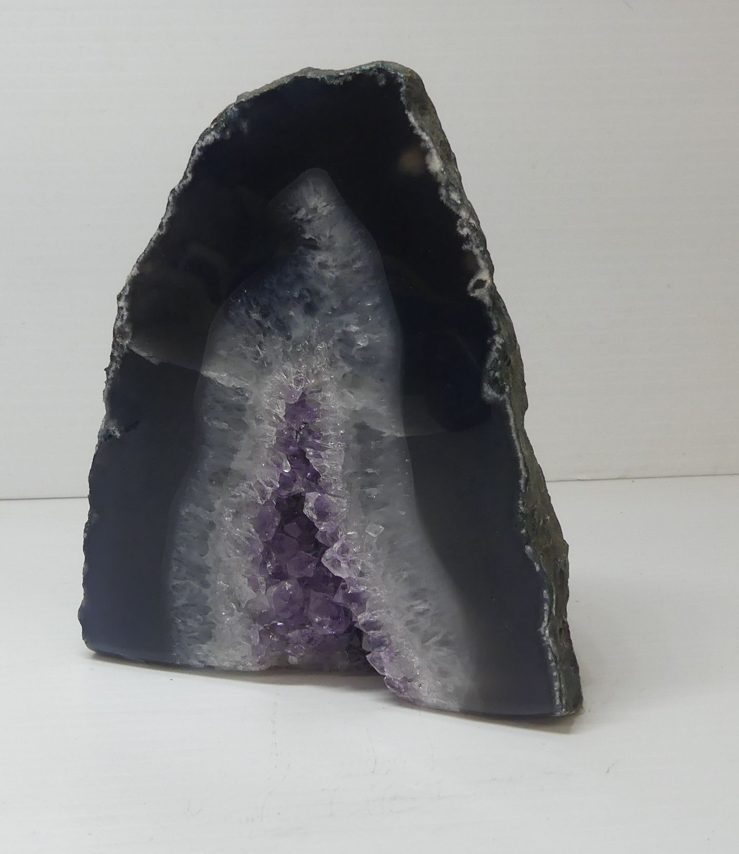 Display this beautiful amethyst geode. This geode features a dark exterior and a hollow interior lined with amethyst crystals. Approximately 6 inches tall.