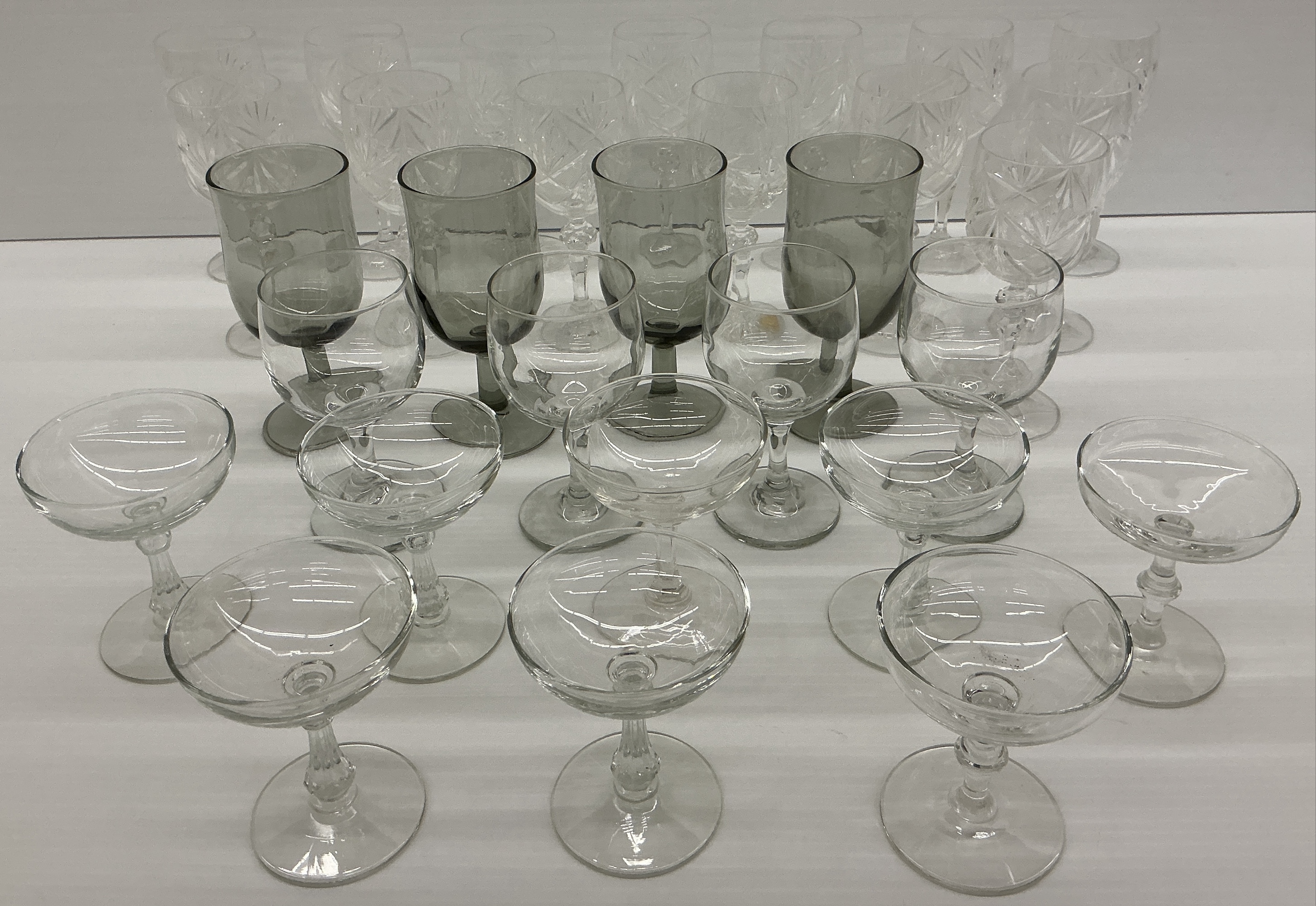 This lot features a diverse collection of stemware, including various shapes, sizes, and colors. You'll find a mix of clear crystal glasses with decorative patterns and gray-tinted wine glasses, ideal for completing a dinnerware set or adding to an existing collection. Tallest 7 in.