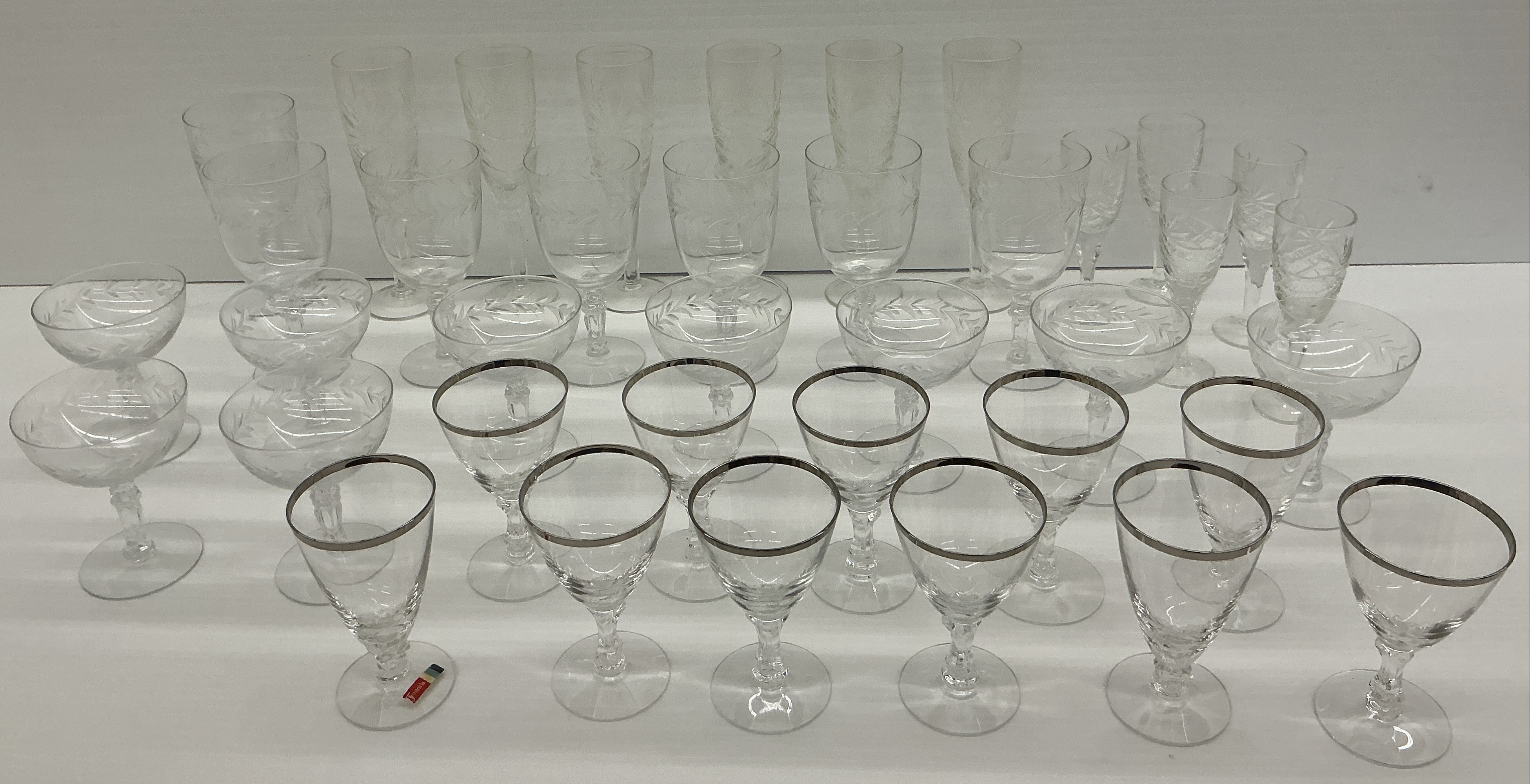 This lot includes a variety of Fostoria glassware pieces. The collection features etched patterns and some with silver rims. It includes several different style glasses with stems. Tallest 8 in.