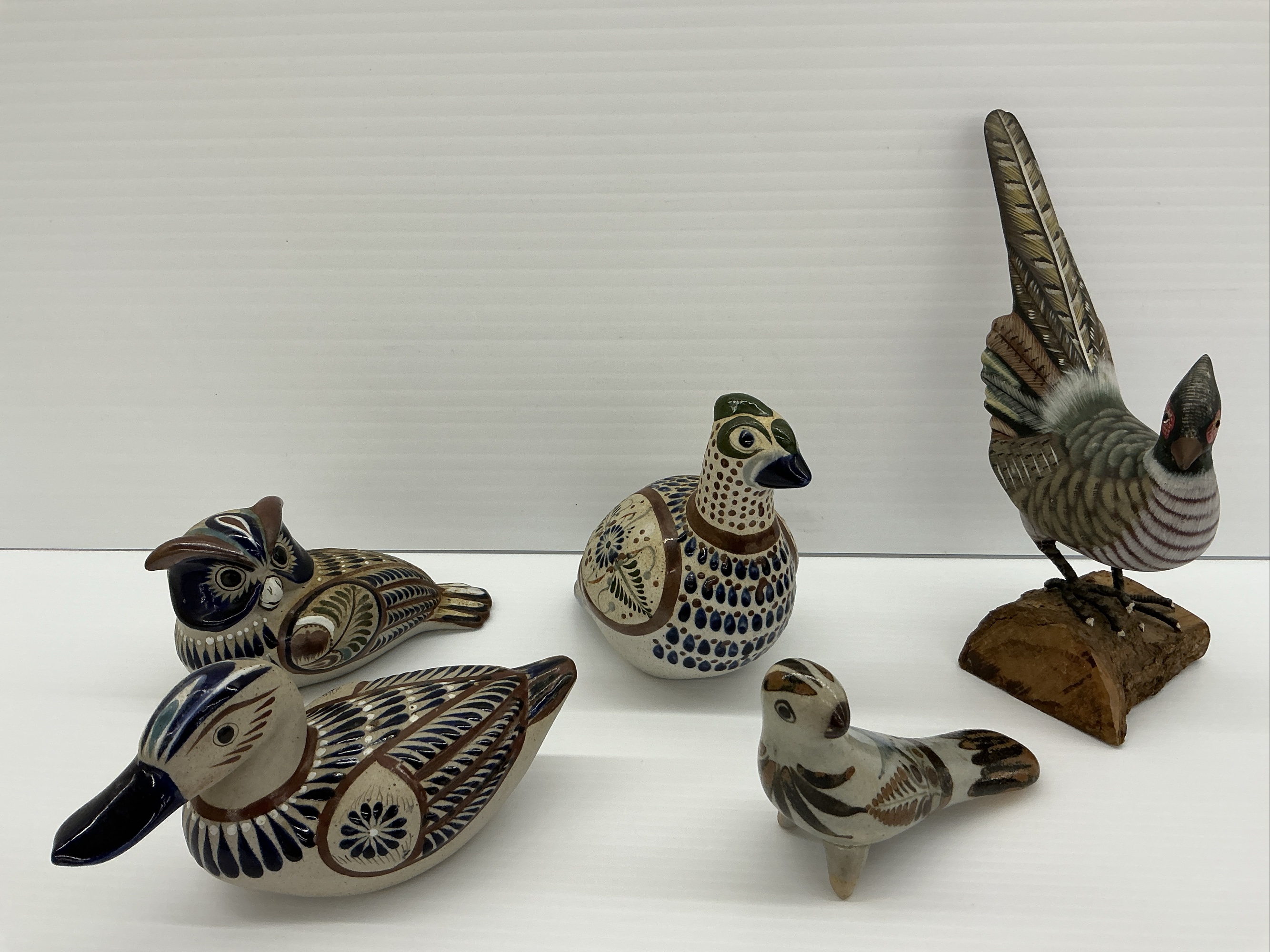 Signed Mexican Pottery Animal Figurines & Wooden Pheasant Sculpture