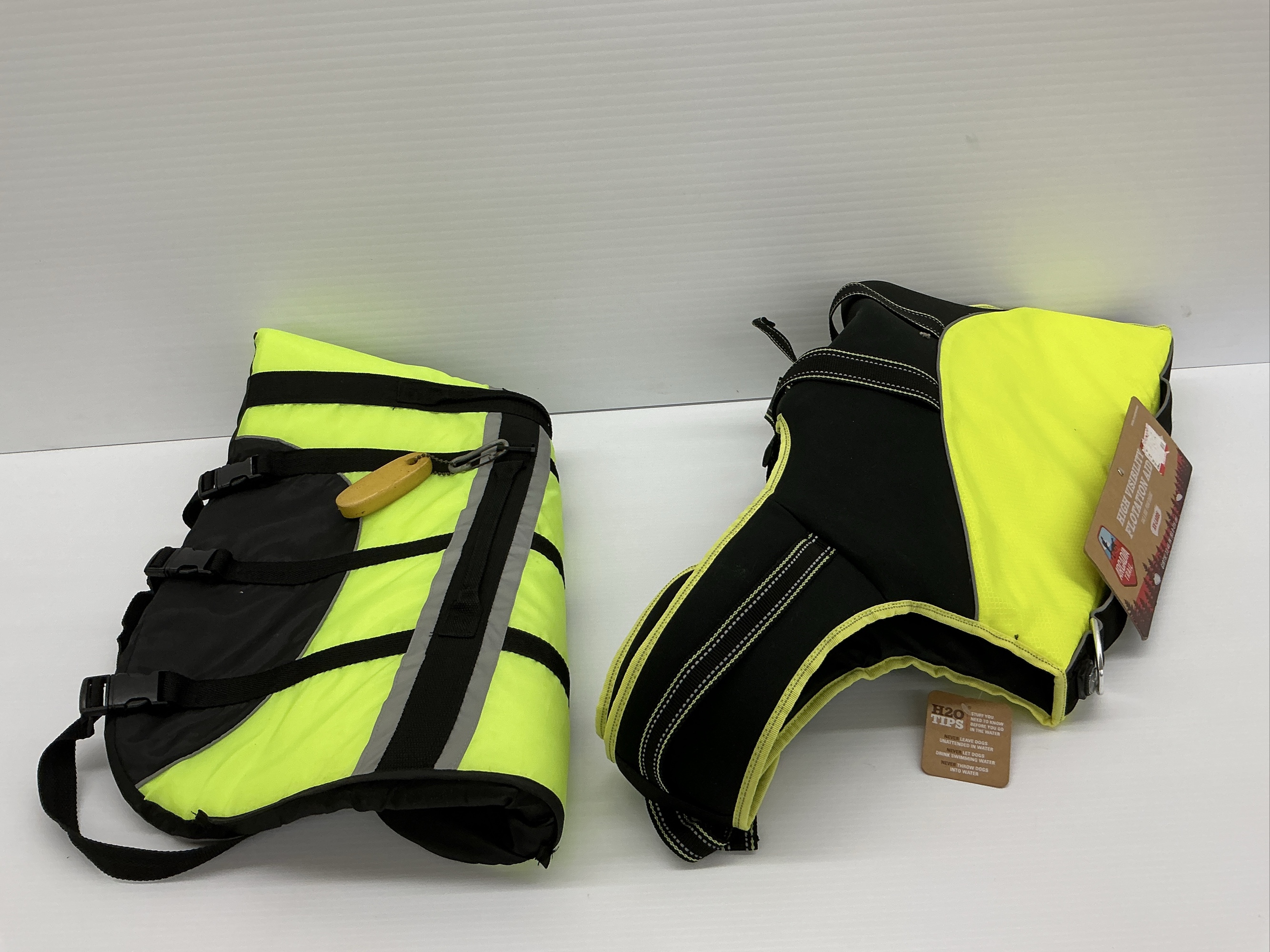Two Arcadia Trail Dog Life Vests. One is size Large and the other is size XX-Large. They are both black and yellow. The girth measurement for the XX-Large is 33-46 inches (83.8-116 cm)