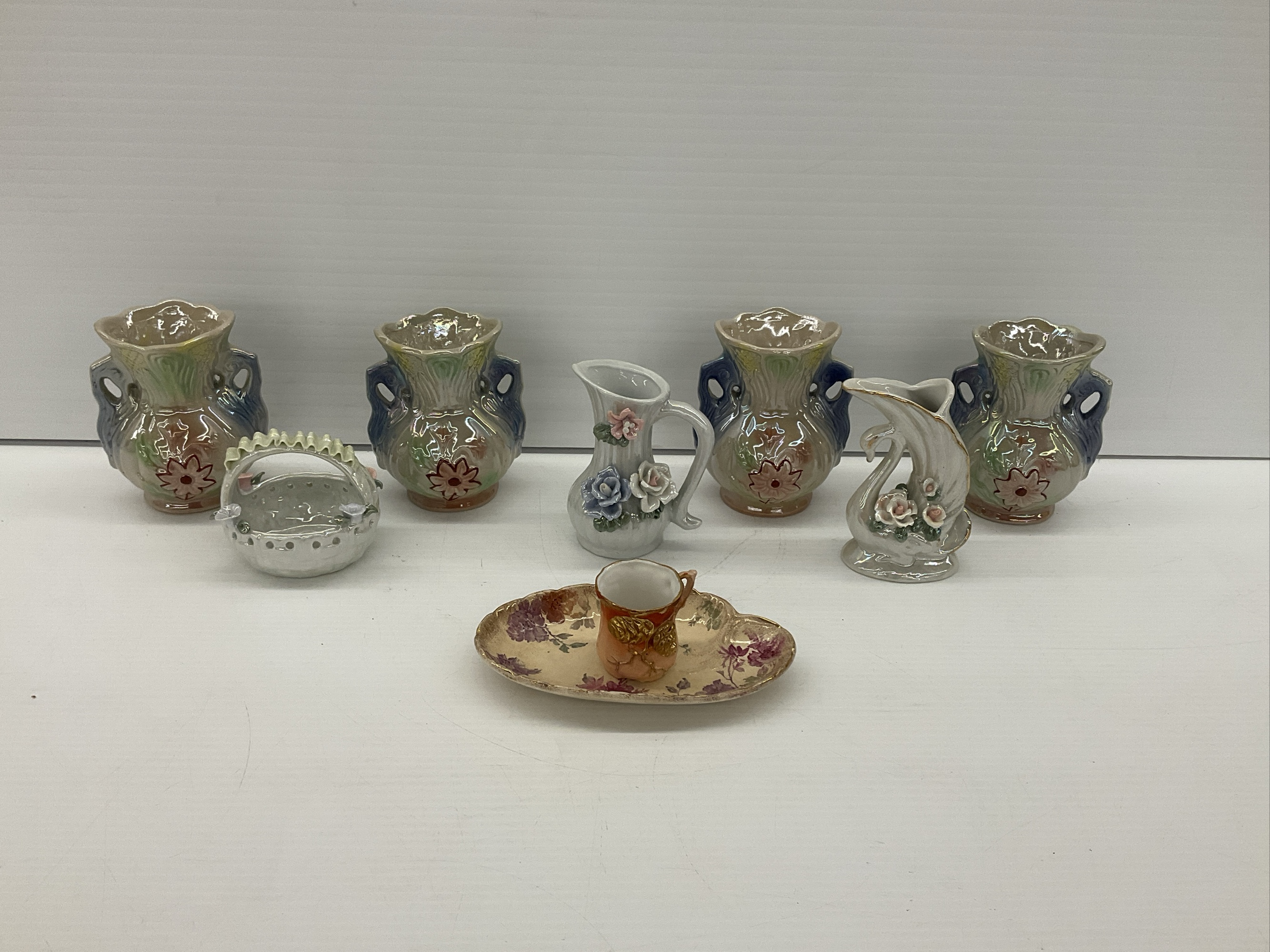Collection of miniature vases, pitchers and a basket from Ki's Collection, made in Brazil. Various floral designs. Includes vases, pitchers and a basket. Tallest 6 in.