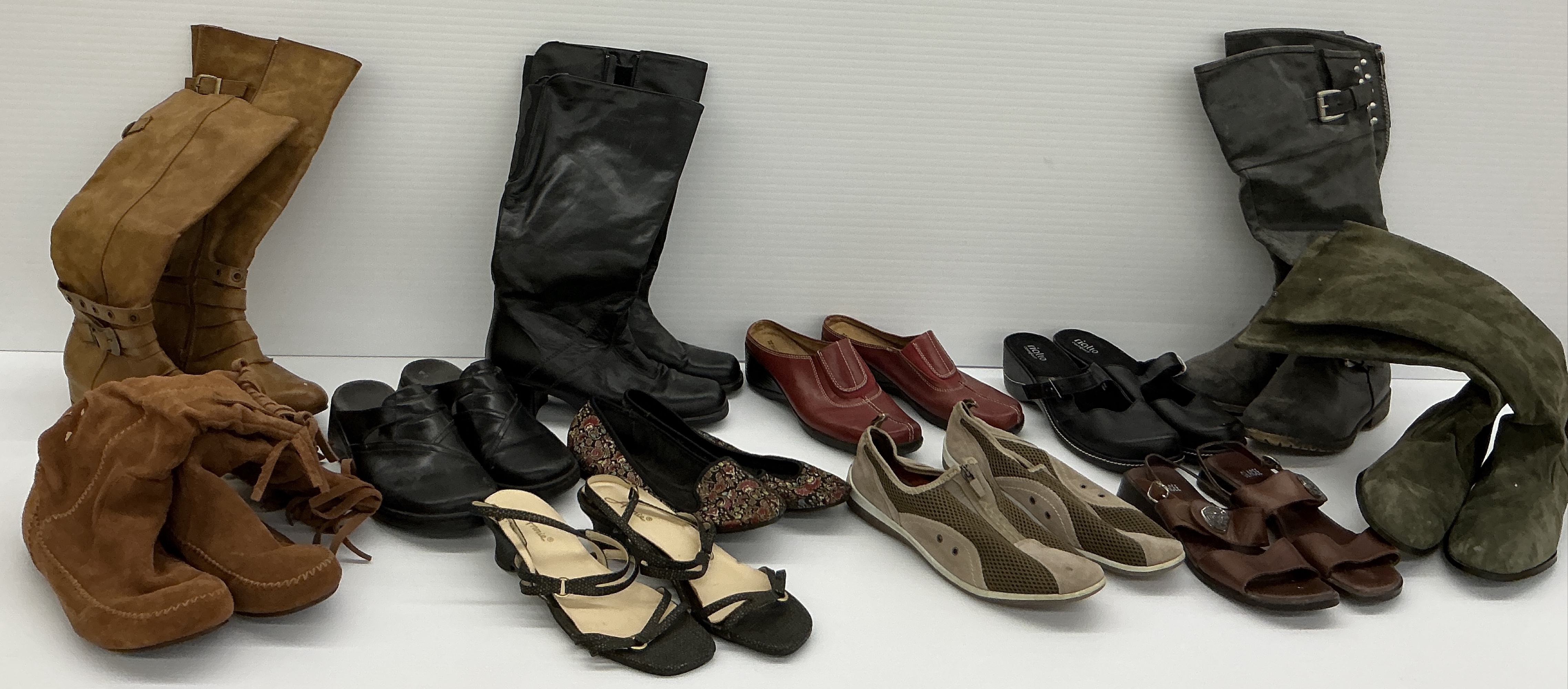 This auction features a variety of women's shoes, including boots, sandals, and flats. Brands included are Naturalizer, Boulevard, Rialto, Rocketdog, Glacee, and Annies. There are tall boots, heeled sandals, slip-on flats, and more. A range of sizes 7 to 11 and styles are available.