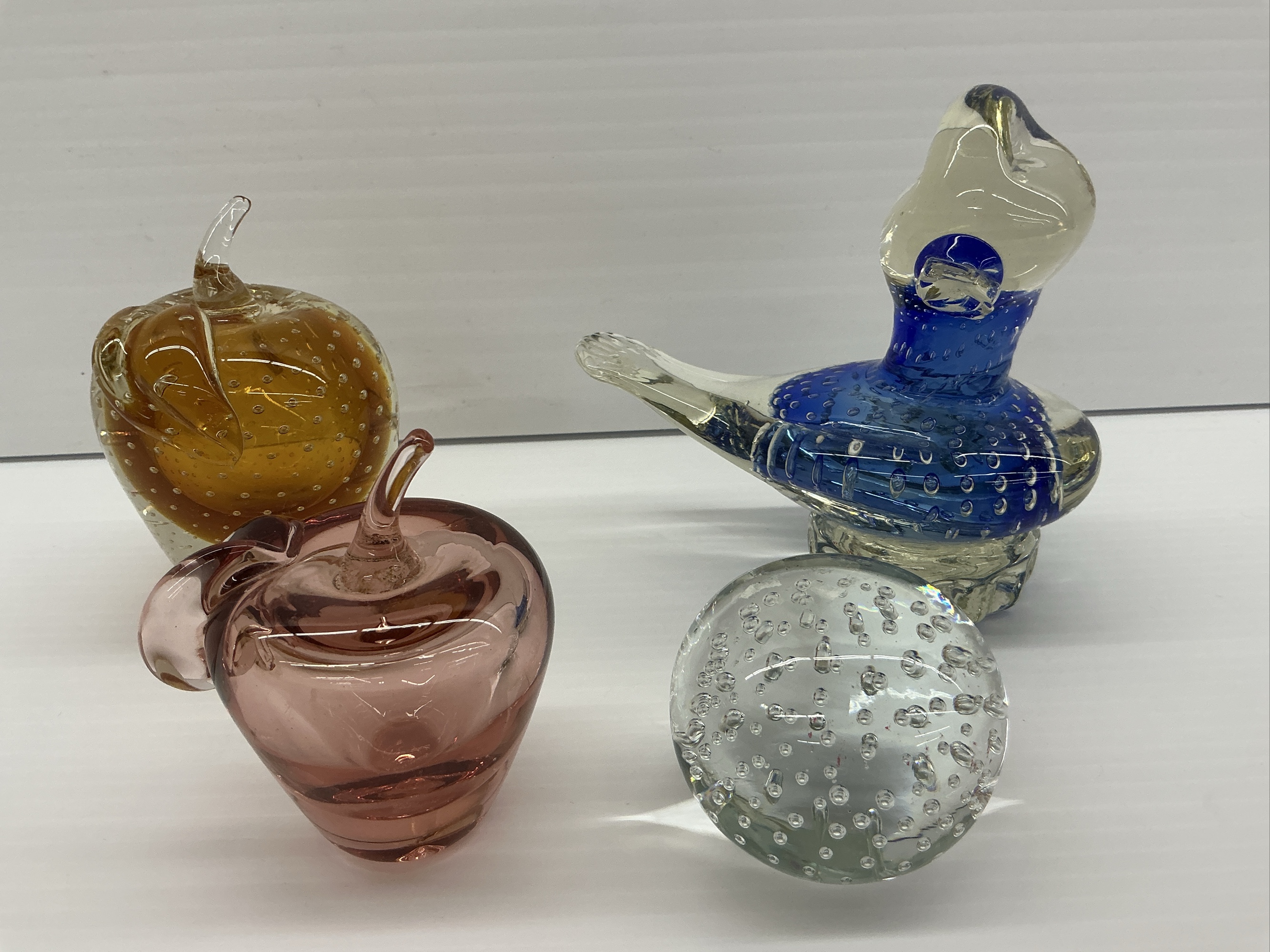 Collection of art glass paperweights featuring apples, a duck (small chip), and a sphere, each showcasing unique colors and bubble effects within the glass. Tallest 5.5 in.