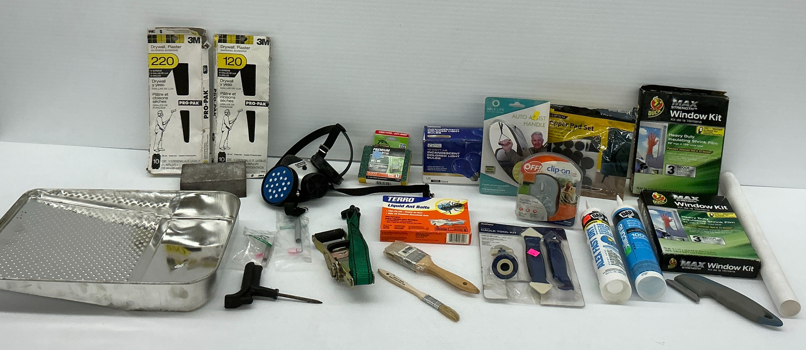 Large mixed lot of home improvement and repair items. Includes paint supplies such as paint tray, brushes, and caulk. Also features window insulation kits, drywall sanding screens, ant bait, a caulk tool kit, and other household items.