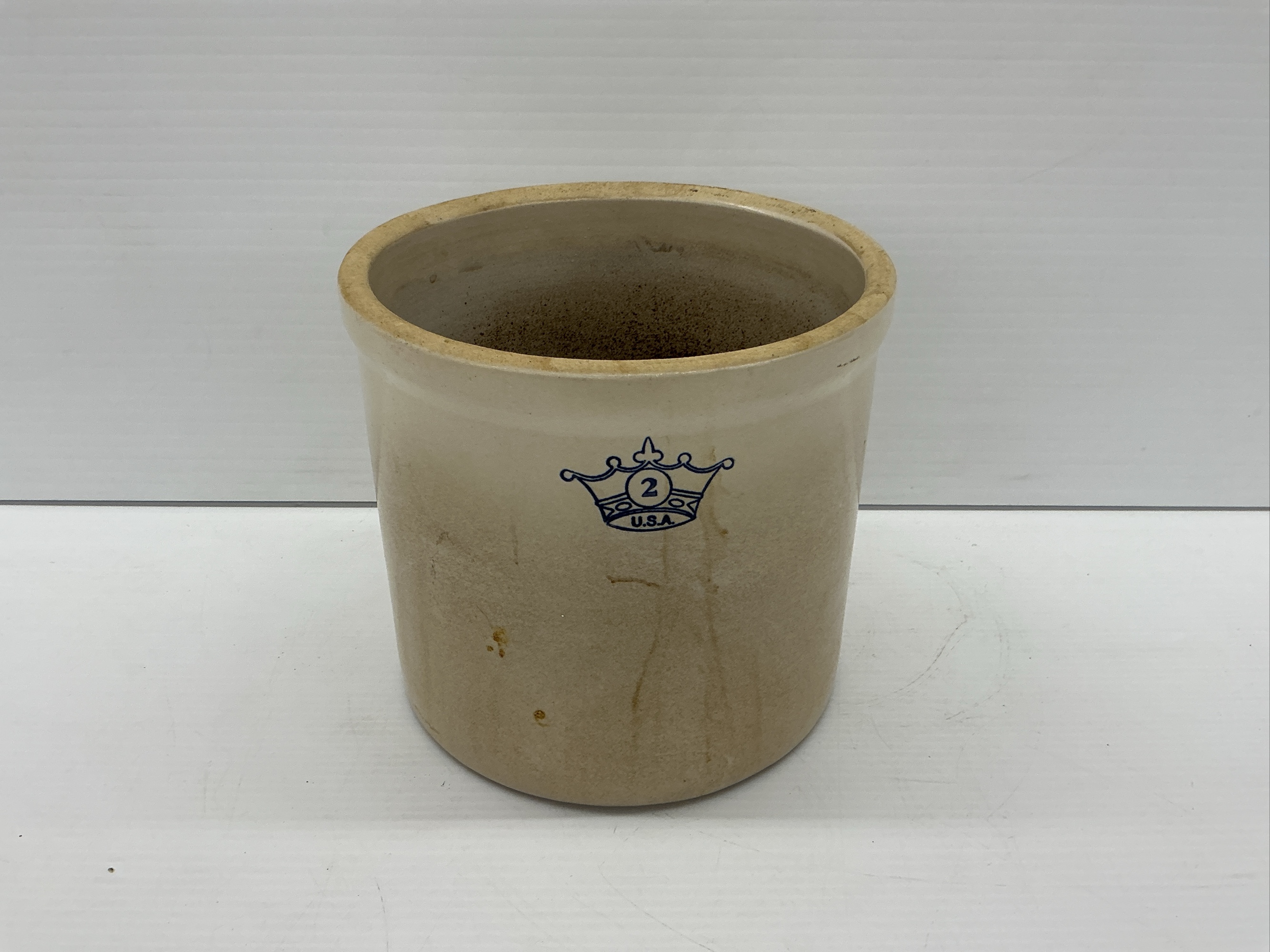 A stoneware crock featuring a crown mark with the letters 'USA'. The crock is cylindrical in shape and marked with a '2'. 9 x 9.5 in.