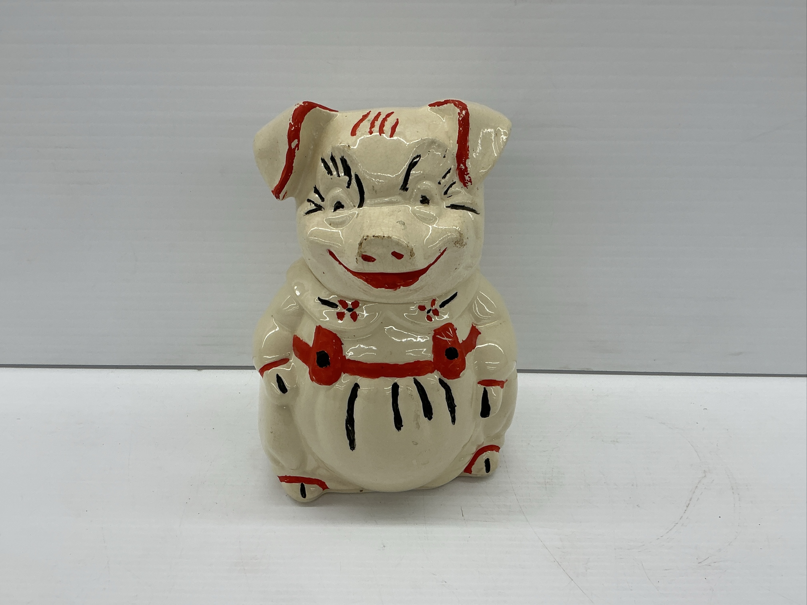 Offered is a pig-shaped cookie jar or decorative container. It features a removable lid that forms the pig's head. The pig is decorated with red accents and black detailing. 12 x 8 x 8 in.