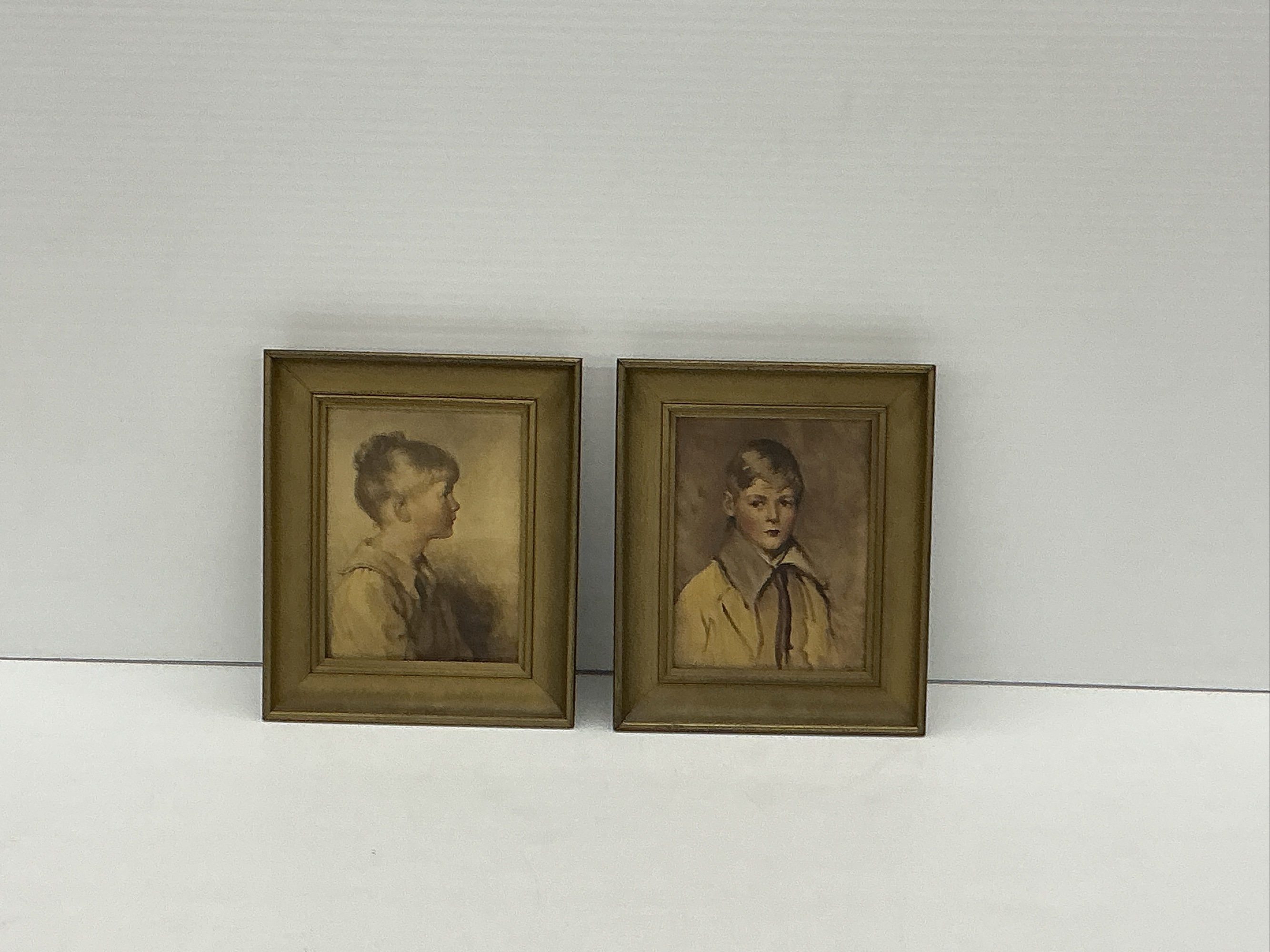 Set of two framed portrait prints by Sidney Bell dated 1923. Includes portraits of Peter and Charlotte in matching gold tone frames. Each marked 'New Size' and 'C.A. Richards Boston, Mass.' 12.5 x 10.5 in.
