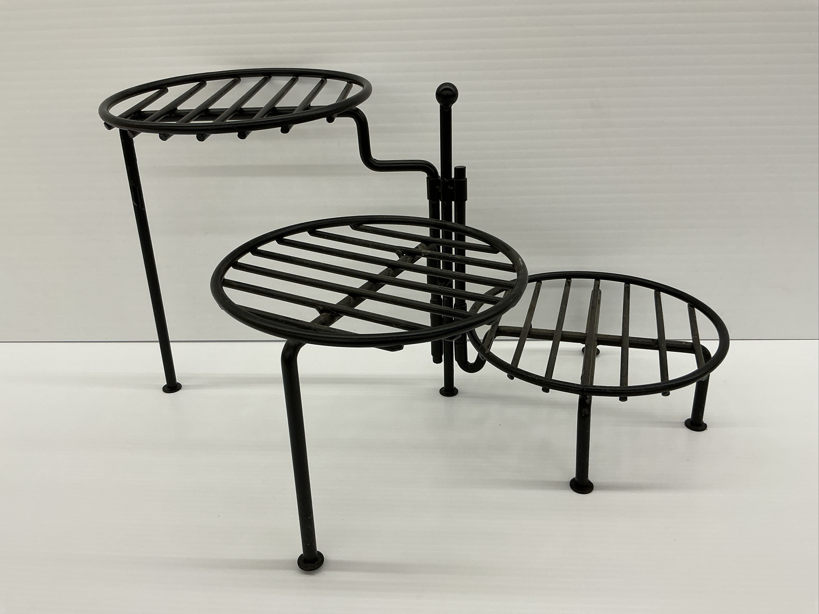 This is a three-tiered metal plant stand. It is black and features three circular platforms at different heights. This would be a great addition to any garden or indoor plant collection. 12 in. tall
